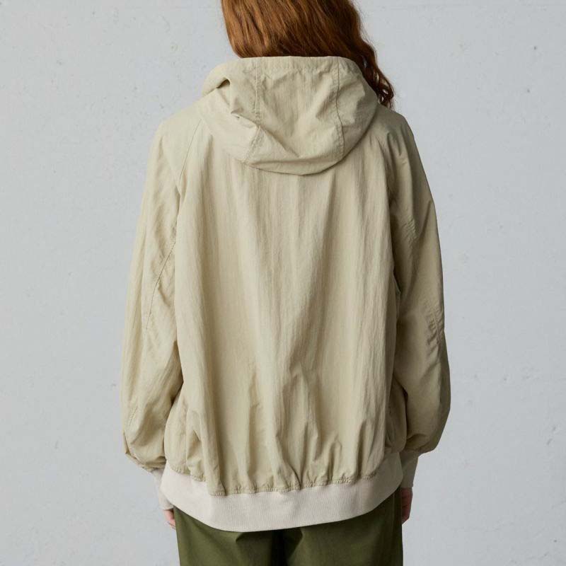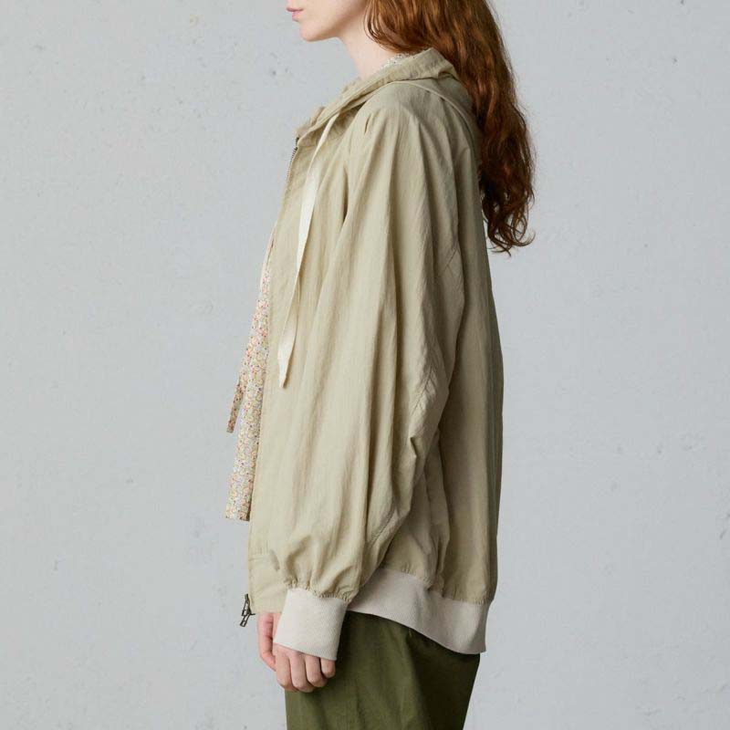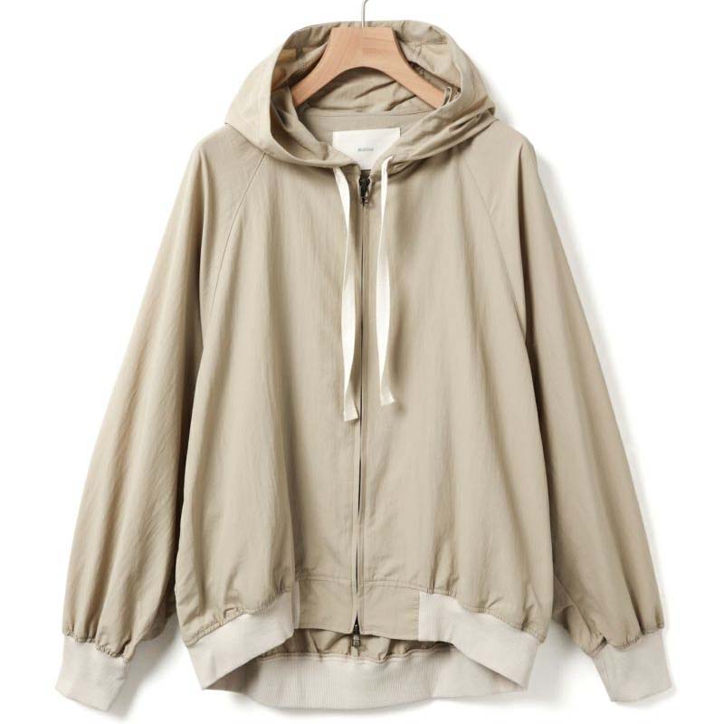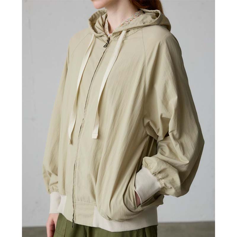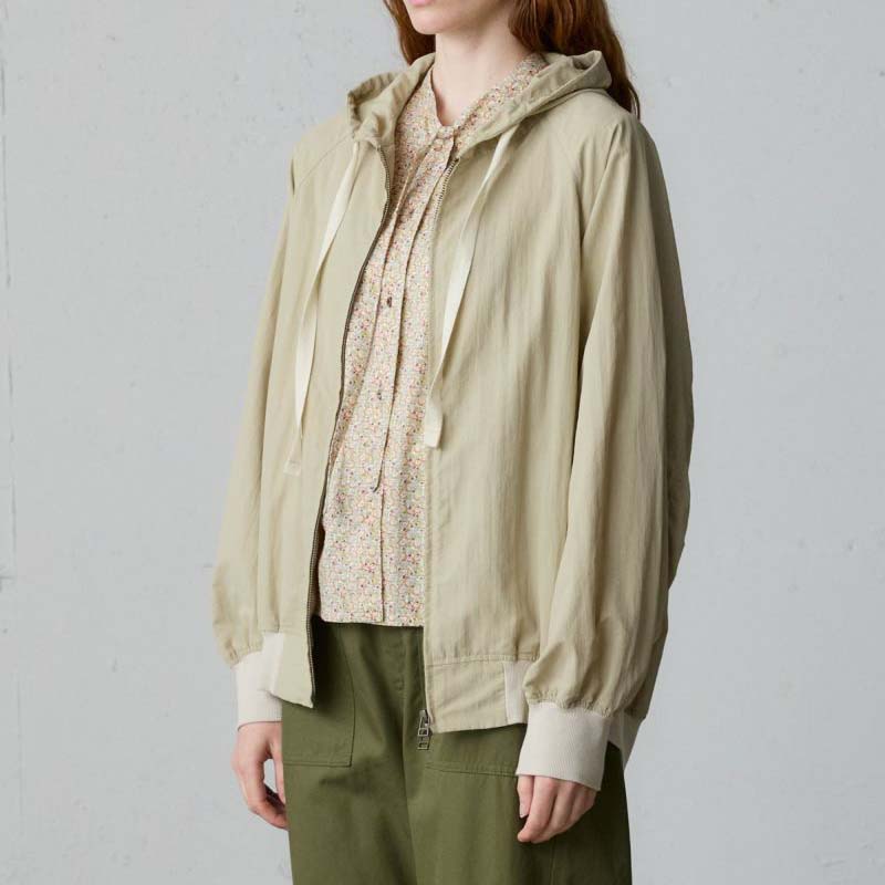 タスラン糸を使用したフード付きブルゾンです。コットンのような風合いのサスティナブルナイロン素材を使用。