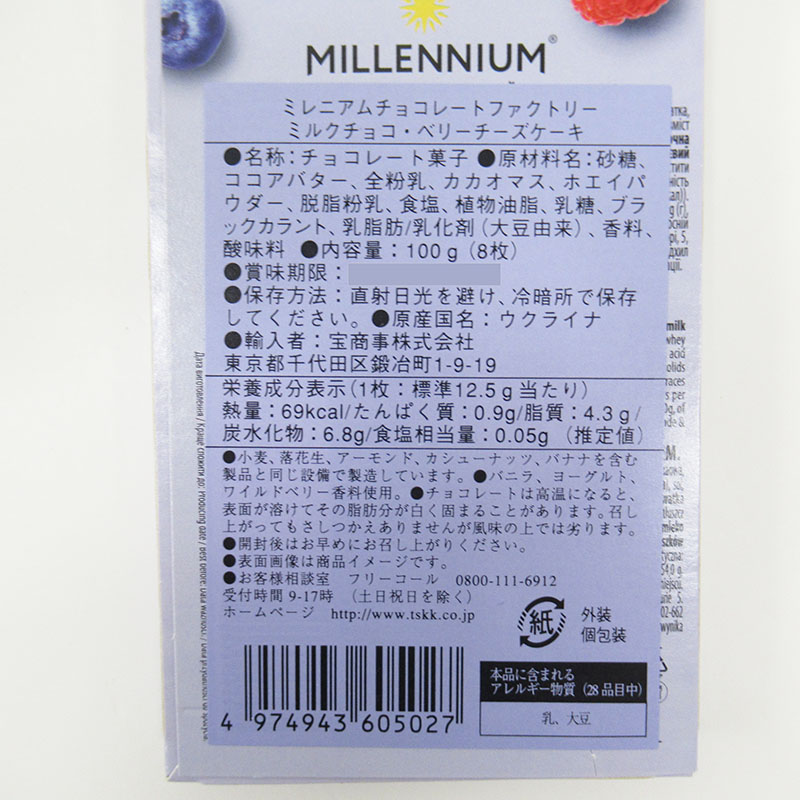 備考 1999年に設立されたミレニアムチョコレートファクトリー社は、ウクライナでトップ3のチョコレートメーカーとして最高品質の製品により2020年から22年までベストチョコレート部門で1位を獲得。最先端の製造設備によりコーシャおよびハラール認証を取得し、現在はEU諸国、USA、アジア、アフリカ等世界35か国以上に輸出しています。