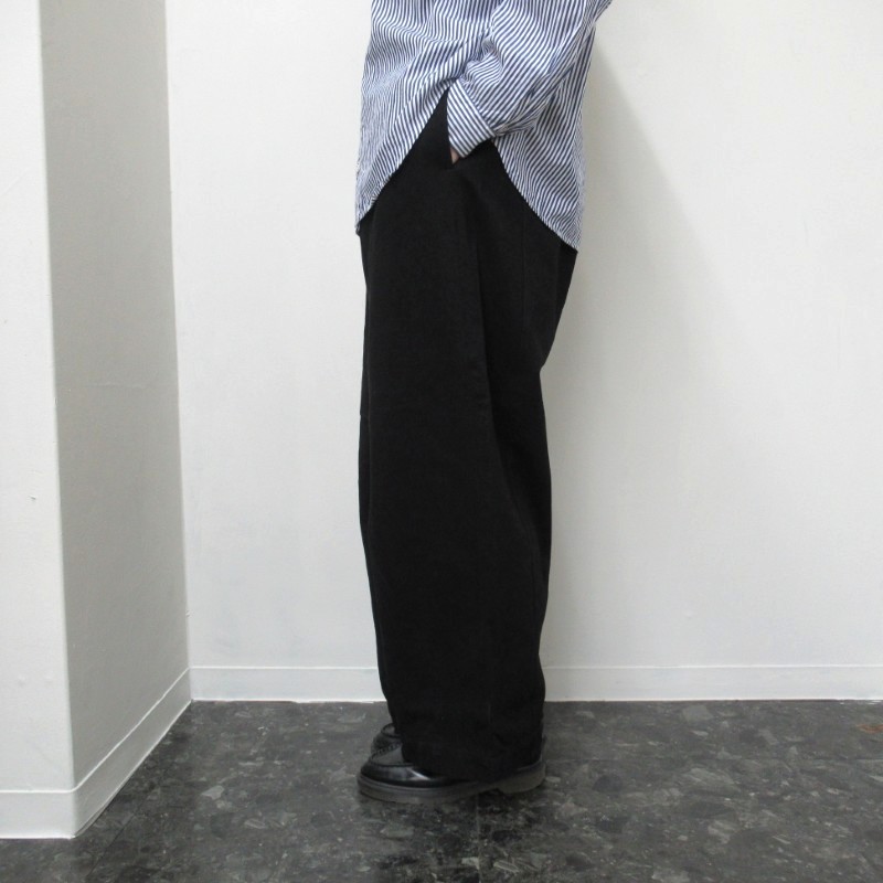 手触りがふわふわと柔らかく、暖かみのあるピーチ起毛のツイル素材を使ったワイドパンツ。