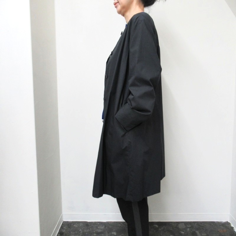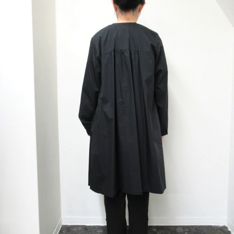 小物使いがしやすいノーカラー。バックのギャザーデザインが女性らしいデザインです。