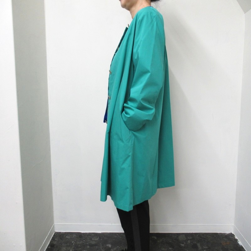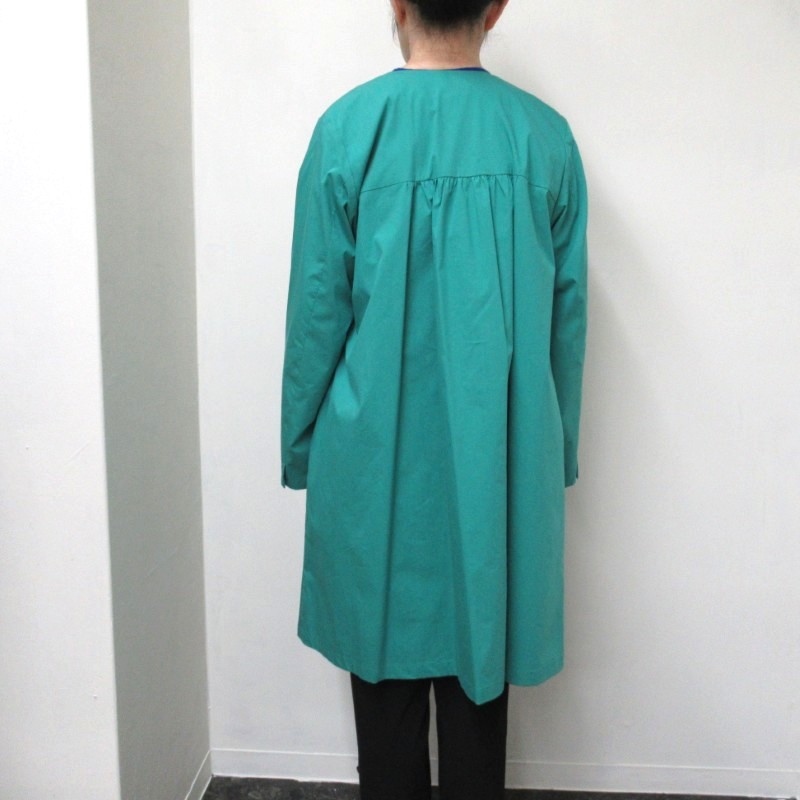 小物使いがしやすいノーカラー。バックのギャザーデザインが女性らしいデザインです。