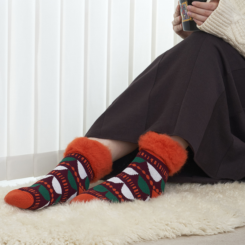 フィンランド発祥の肌側がふわふわに起毛された靴下は、驚くほど暖か。肌側の起毛は特殊な起毛機をさらにカスタマイズして、もこもこソックスの為にオーダーメイドしています。