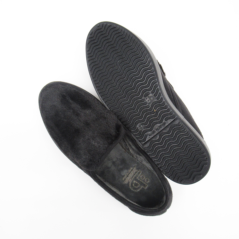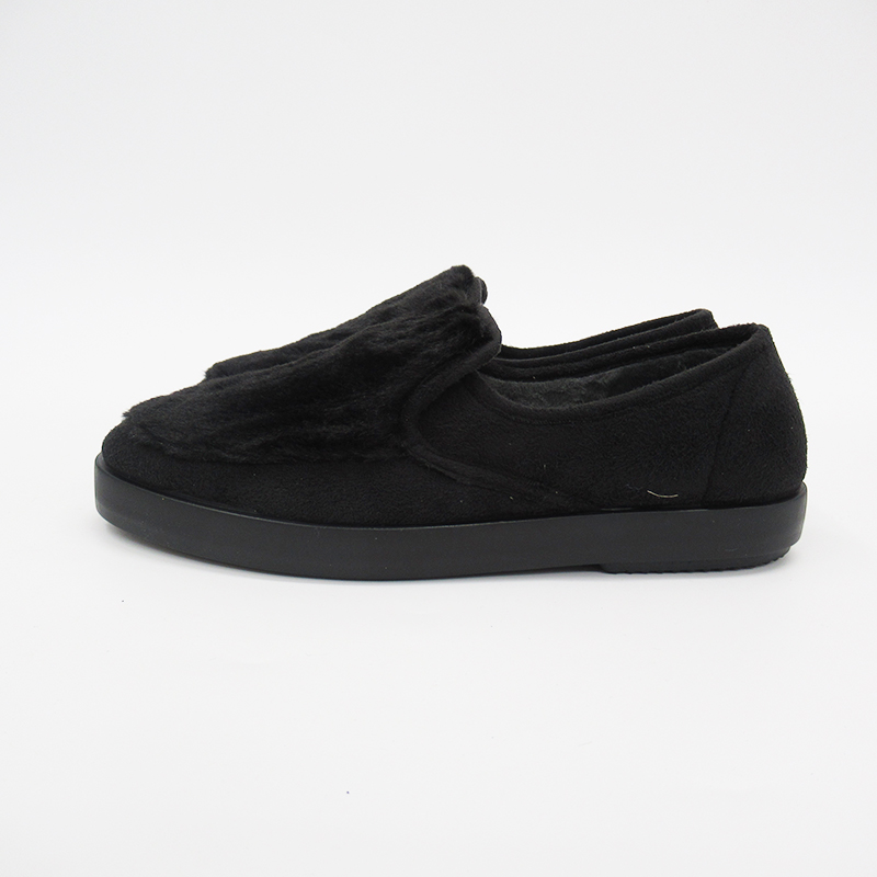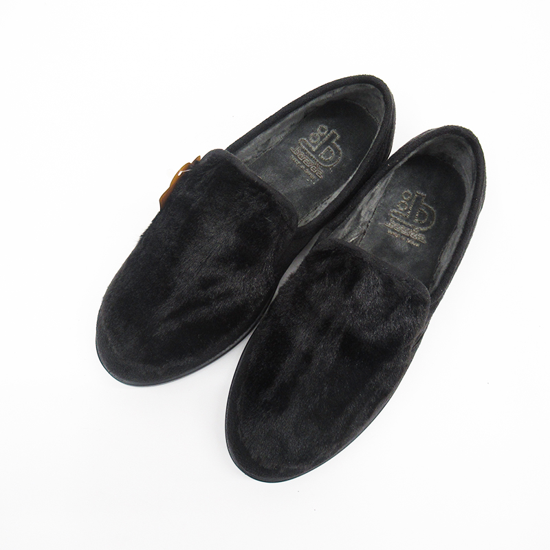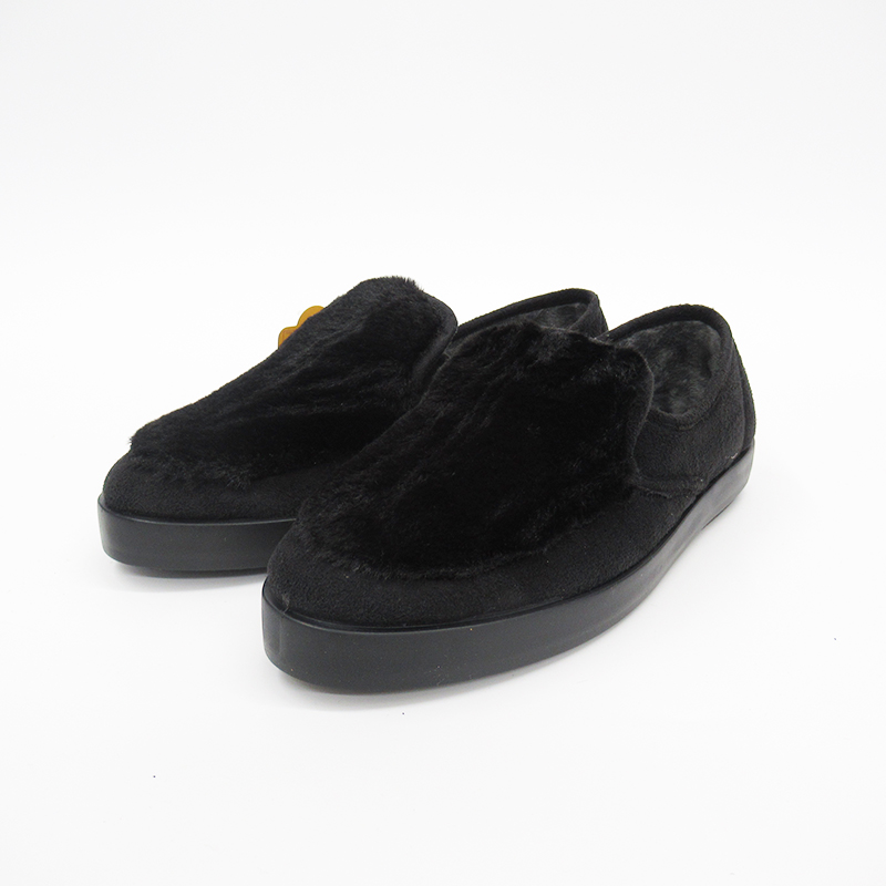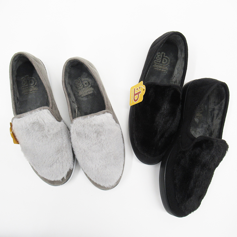 コロンとした丸いフォルムと暖かみのあるフェイクファーがかわいいスリッポン。