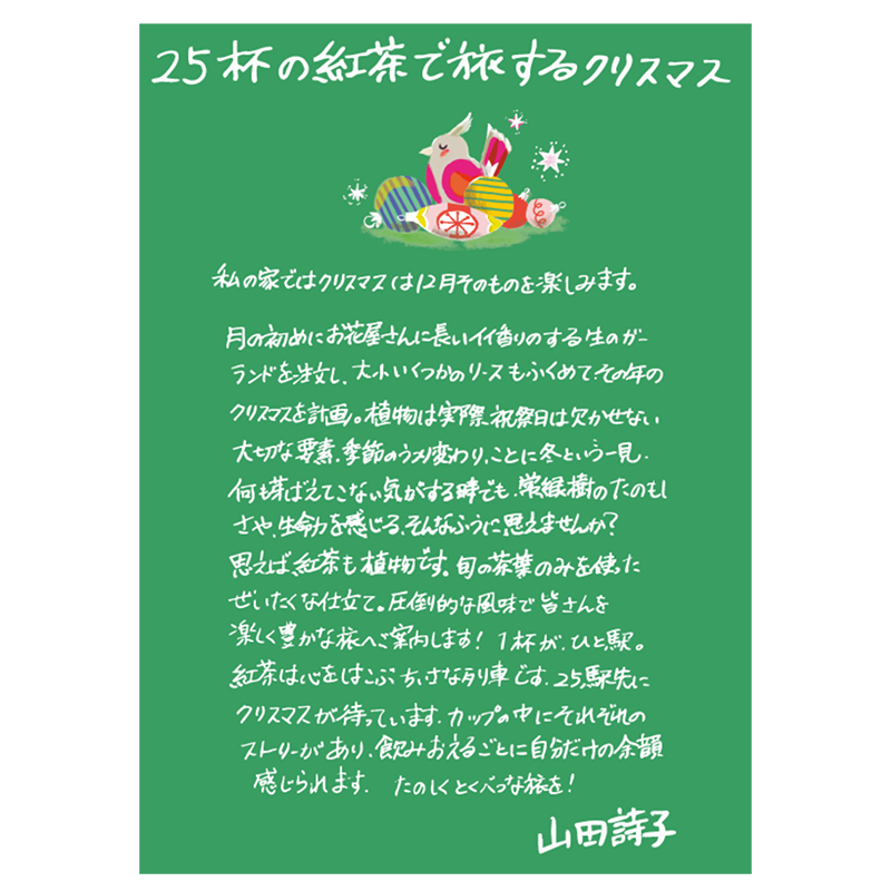 | 備考 | ティーバッグの中身は、この冬の特別な2種類の紅茶。 ・バニラの甘い香りの「ホリデーバニラ」×13 ・りんごと洋梨香る「ノエルフルーツ」×12 毎日交互に現れる2つの紅茶が、クリスマスまでの日々をより楽しいものに彩ります。 |