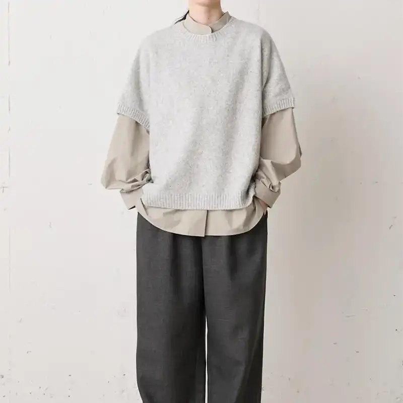 ベーシックなクルーネックなので、シャツやカットソー、ワンピースとのレイヤードも楽しめ、幅広いコーディネートに対応します。