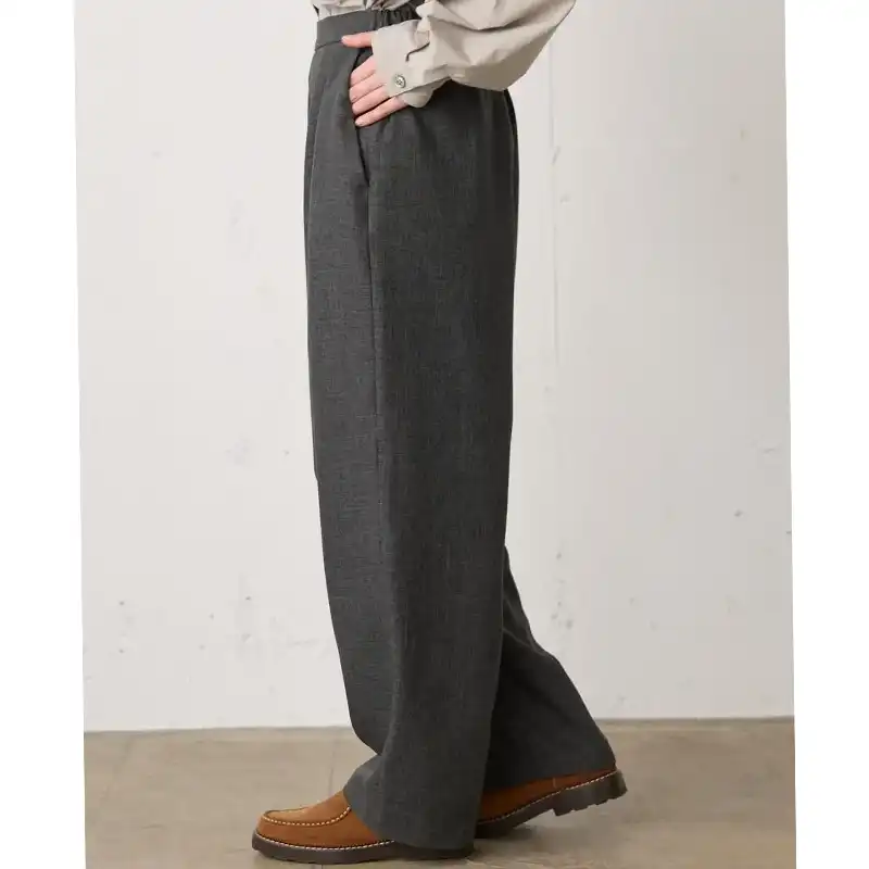 ウールツイードのような風合いを持つポリエステル素材を使用したスラックスパンツ。