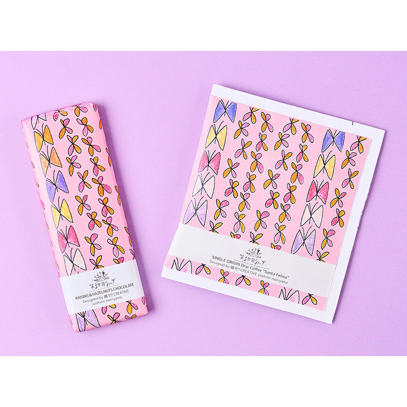 レーズン&ヘーゼルナッツチョコは、 森山 幸美さんの「蝶々とお花」のアートワークがデザインされたパッケージ。