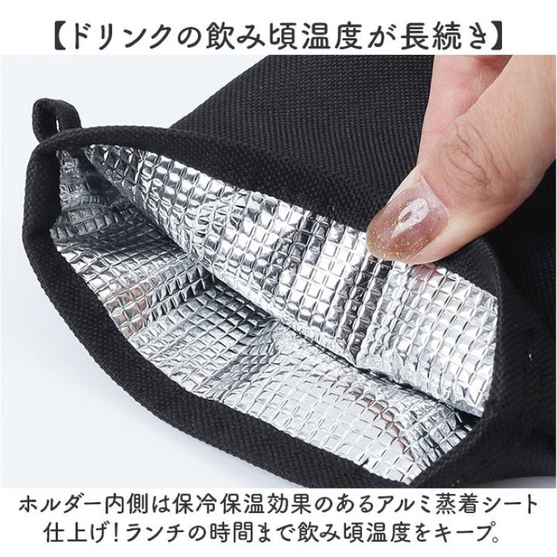 【ドリンクの飲み頃温度が長続き】ホルダー内側は保冷保温効果のあるアルミ蒸着シート仕上げ!ランチの時間まで飲み頃温度をキープ。