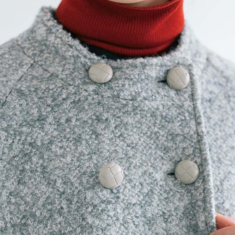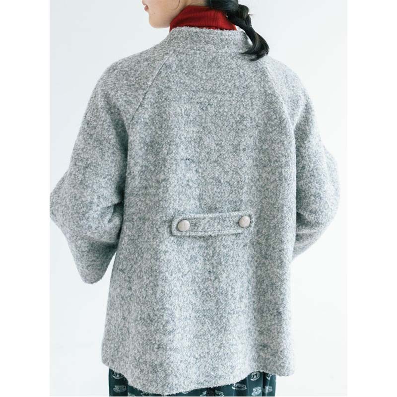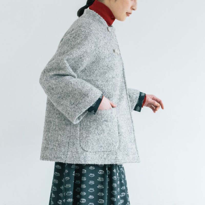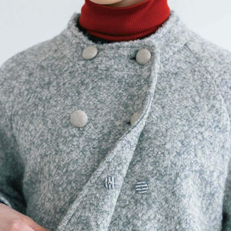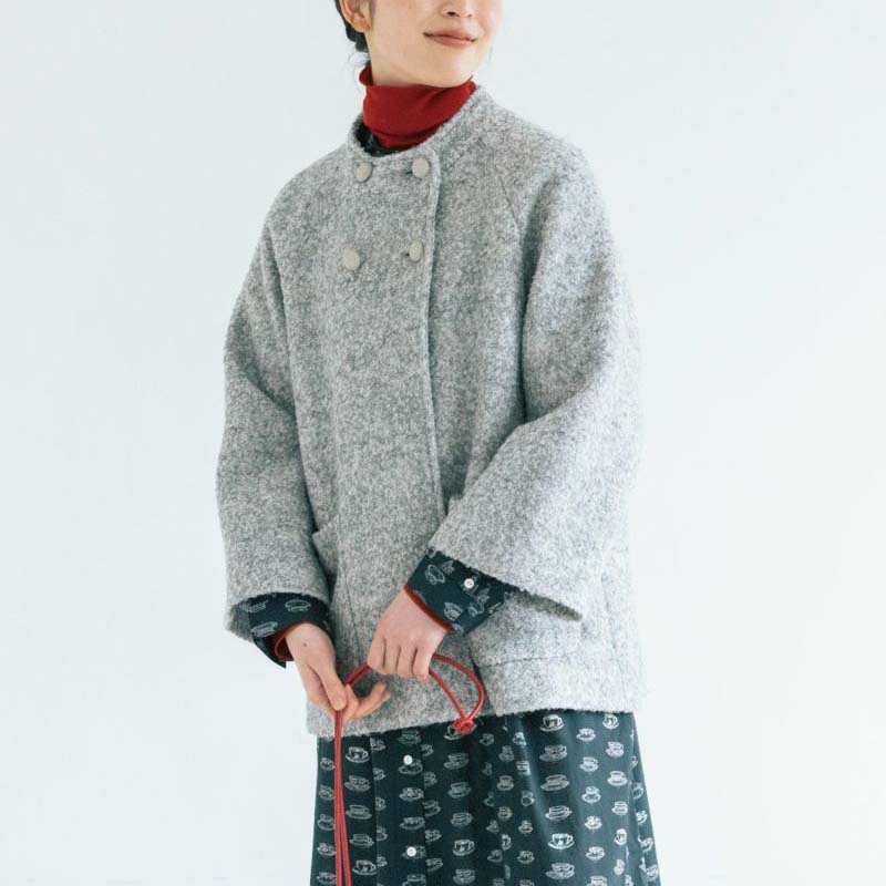 少しスタンドさせた衿にラグランスリーブ、ダブルブレストのデザインがクラシカルで上品な雰囲気のショートコートです。