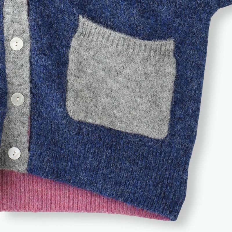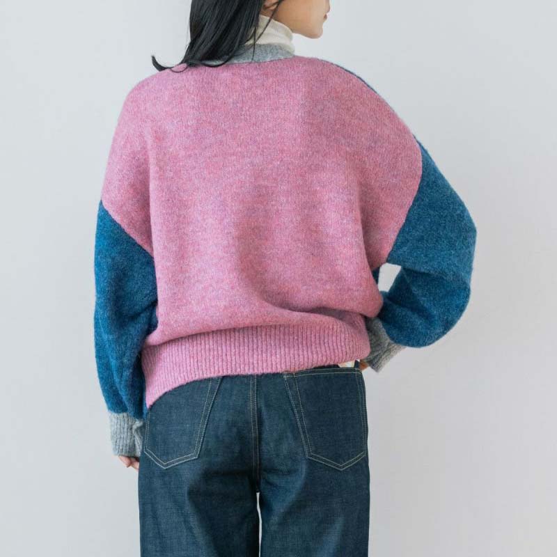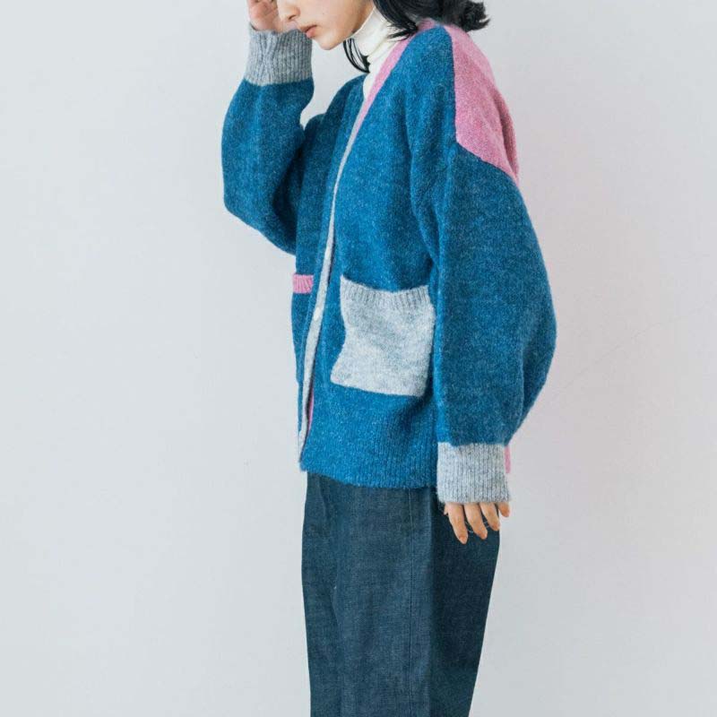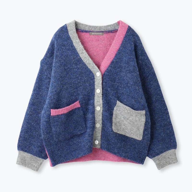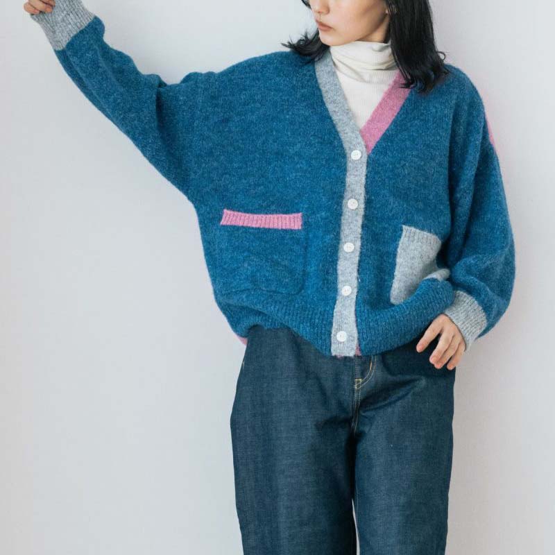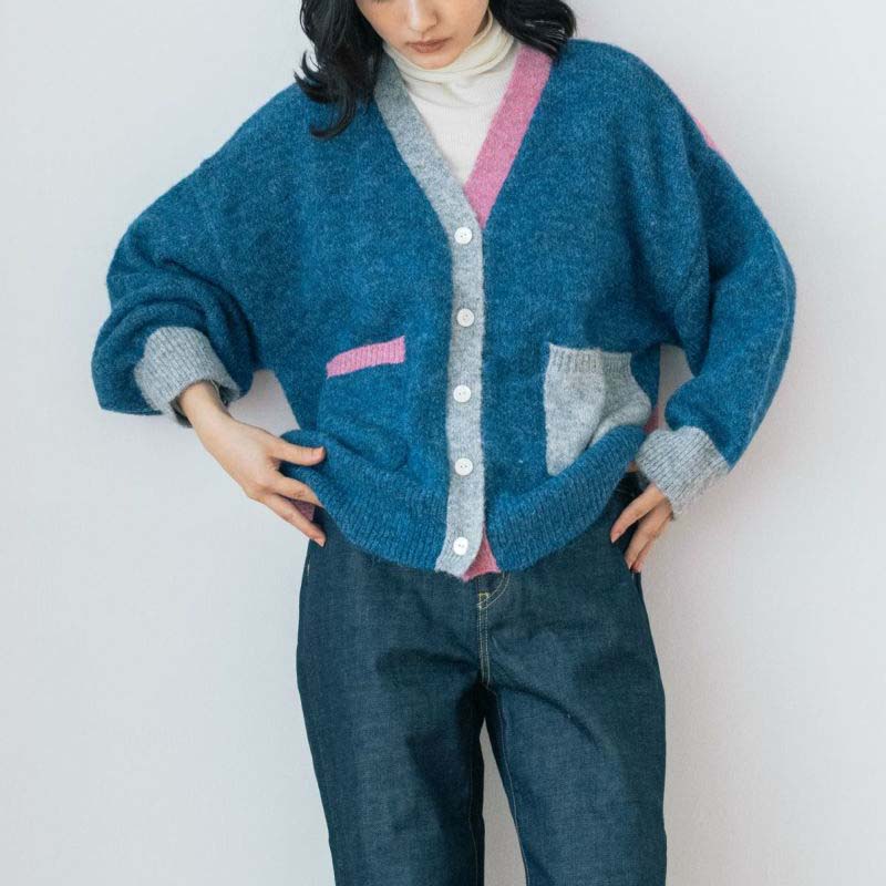 ふわふわとしたモヘアライクな素材感に、カラフルな切り替えが映えるデザインカーディガン。