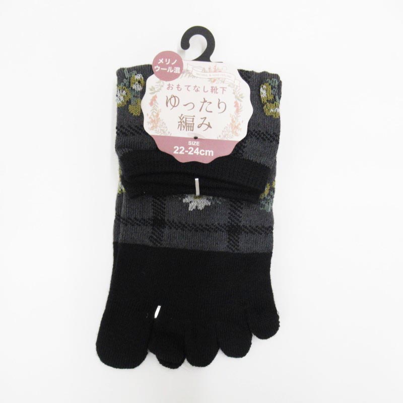 おもてなし靴下 クルー ゆったり編み5本指 /フレーム花柄 BK