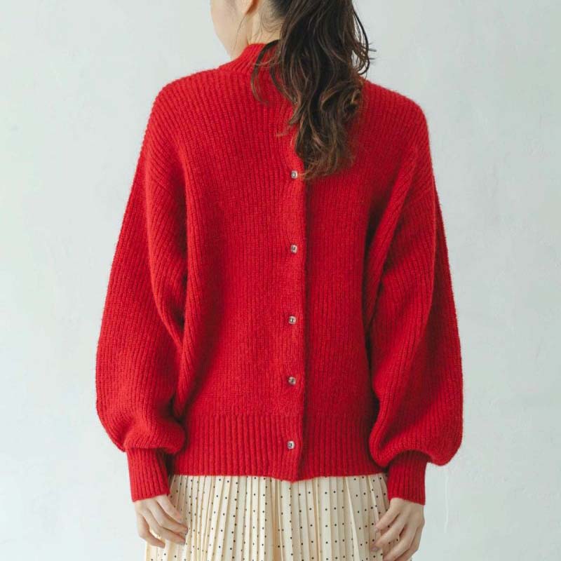 ふんわりとした袖に長めにとったリブが女性らしいニット。四角いボタンもポイントです。
