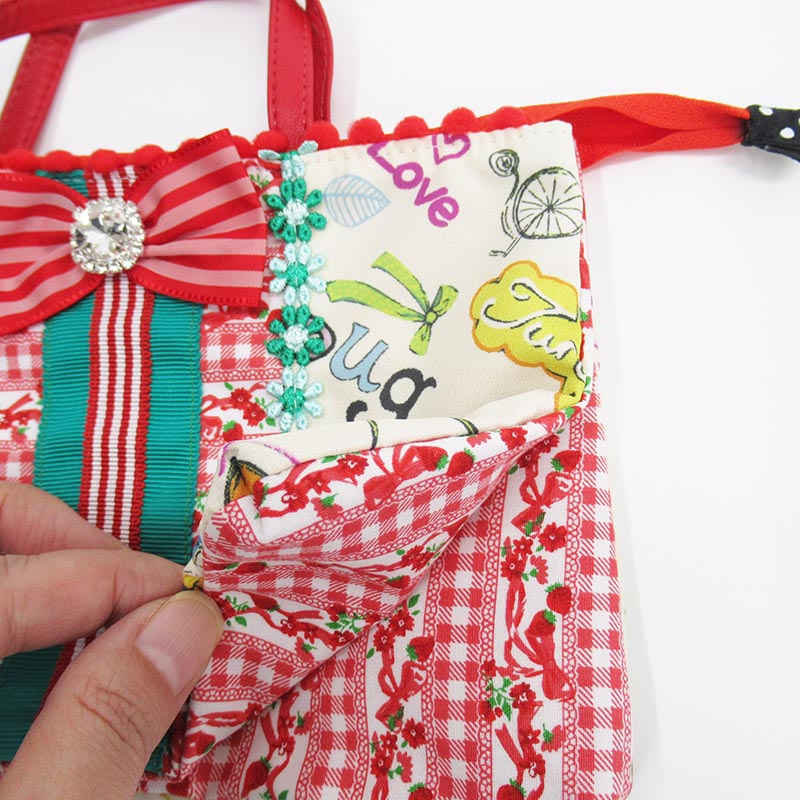 TUNICのタフタ転写プリント、ファスナーを開けると3か所に収納できます。