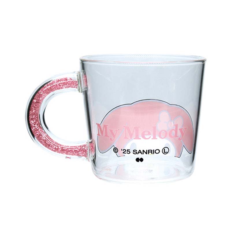 持ち手の中にビーズが入っている、サンリオキャラクターズがデザインされた耐熱ガラスマグです。