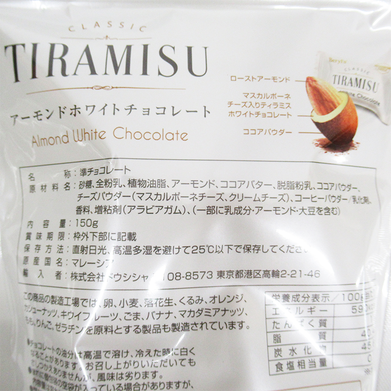 マスカルポーネ使用のティラミスホワイトチョコでアーモンドを包みました。上品な甘さをお楽しみください。