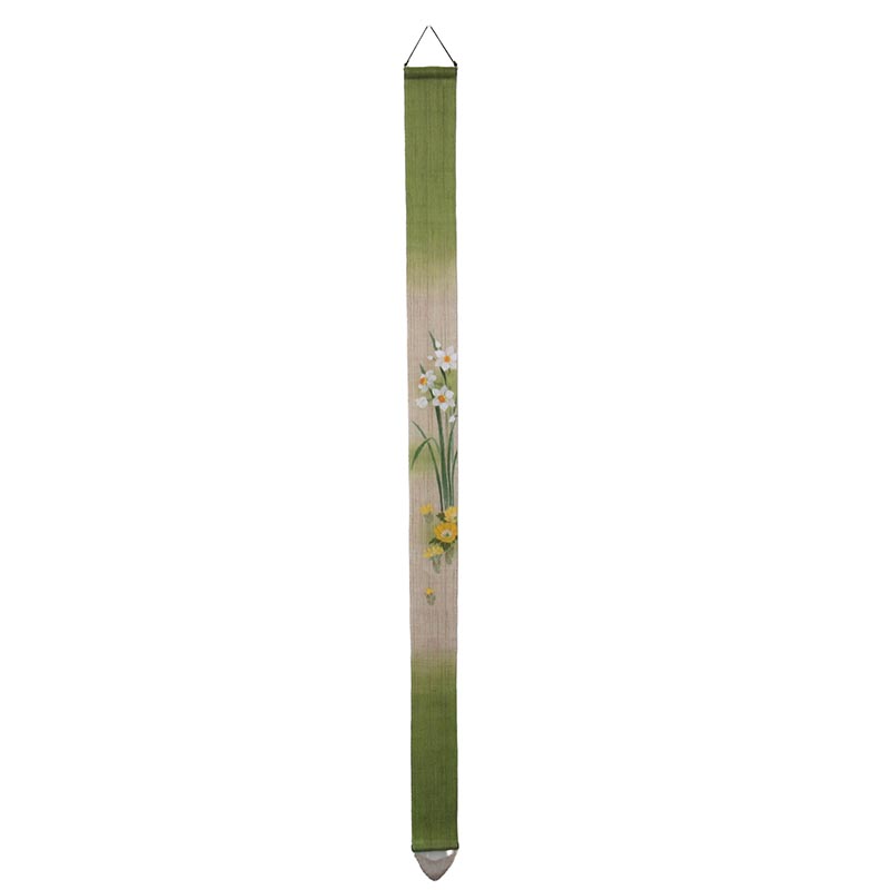 1点1点手作業で引染や型染、手描きなど模様に応じて伝統技法を使い分けて染め上げて作られた、巾がスリムで飾る場所を選ばないタペストリー。 飾り方は様々。柱に1本で飾ったり、リビングルーム、玄関先、窓辺、または数本組み合わせてのれんのようにしてもお使い頂けます。 草花や歳時をモチーフにした季節感たっぷりの柄が多く、日常の中で四季をより身近に感じられます。