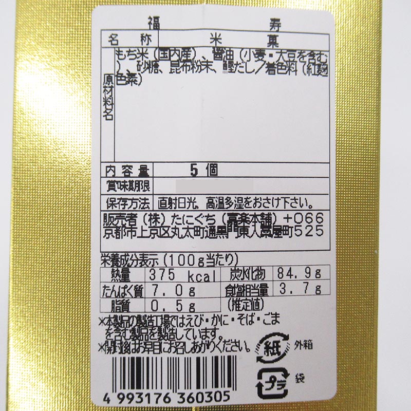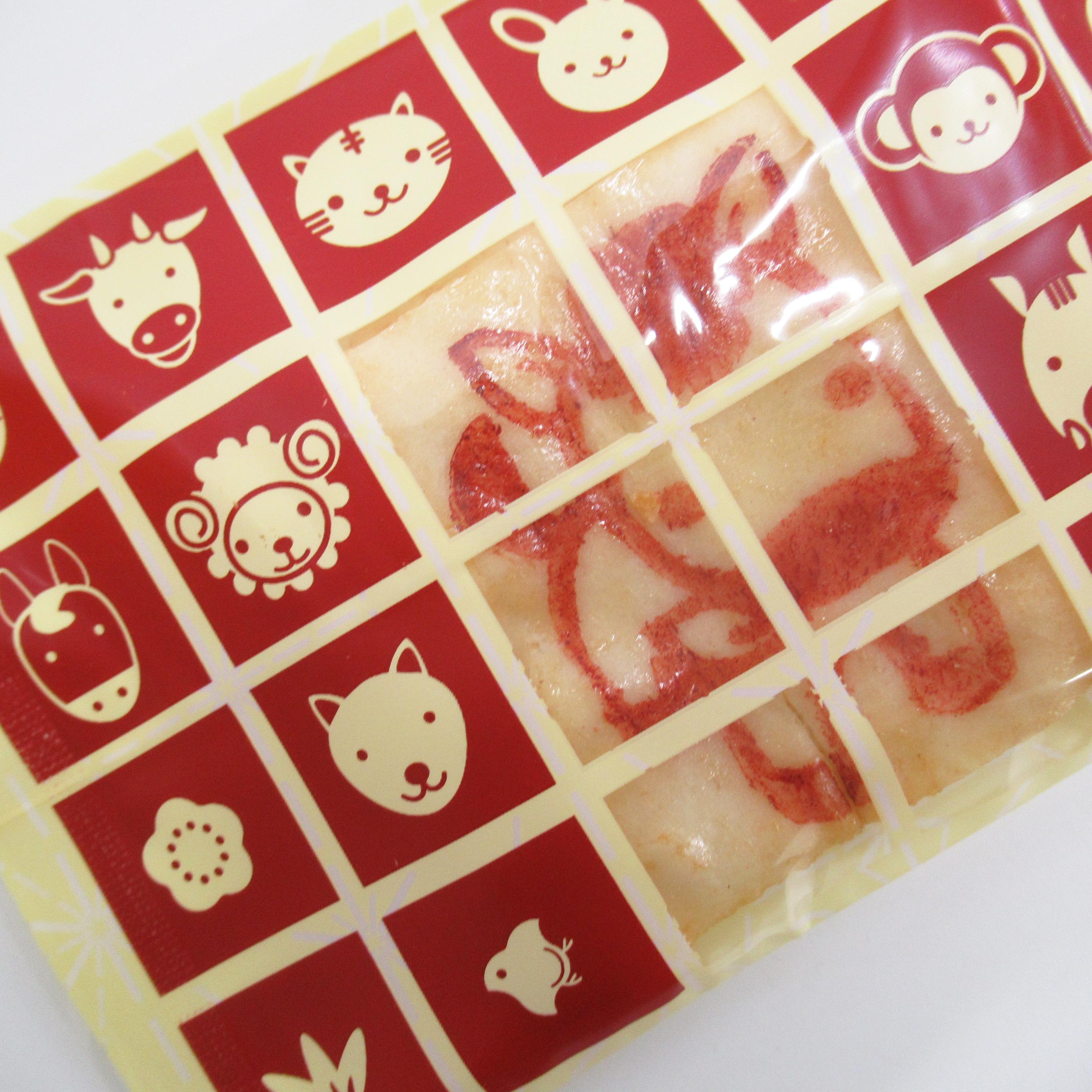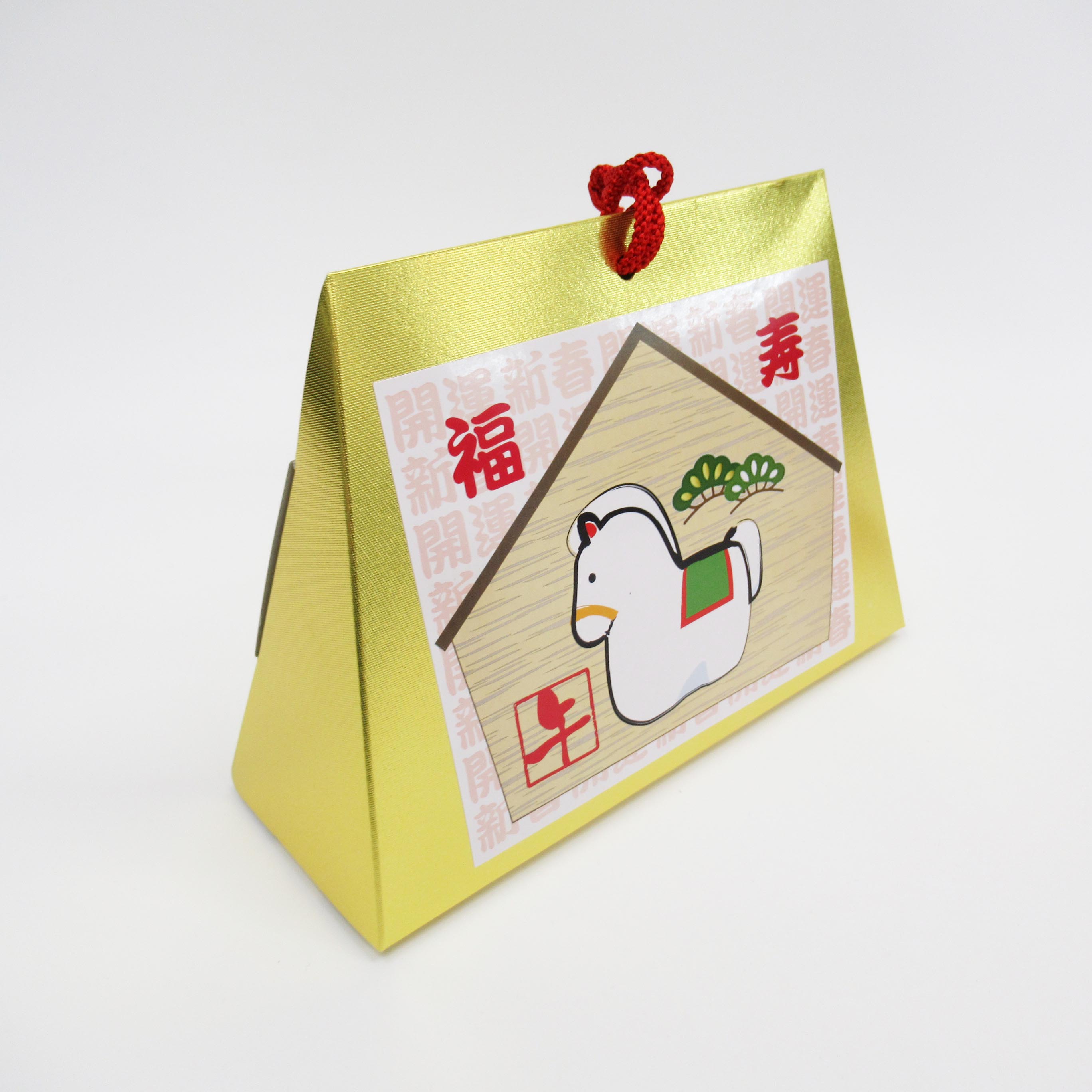 大判の手焼きあられに干支を描いて、金箱に包みました。