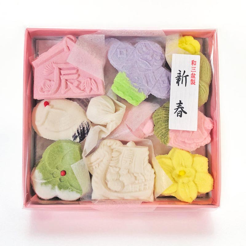 干支や凧、鶴亀など新春にちなんだものを和三盆で作り小箱に詰合せました。