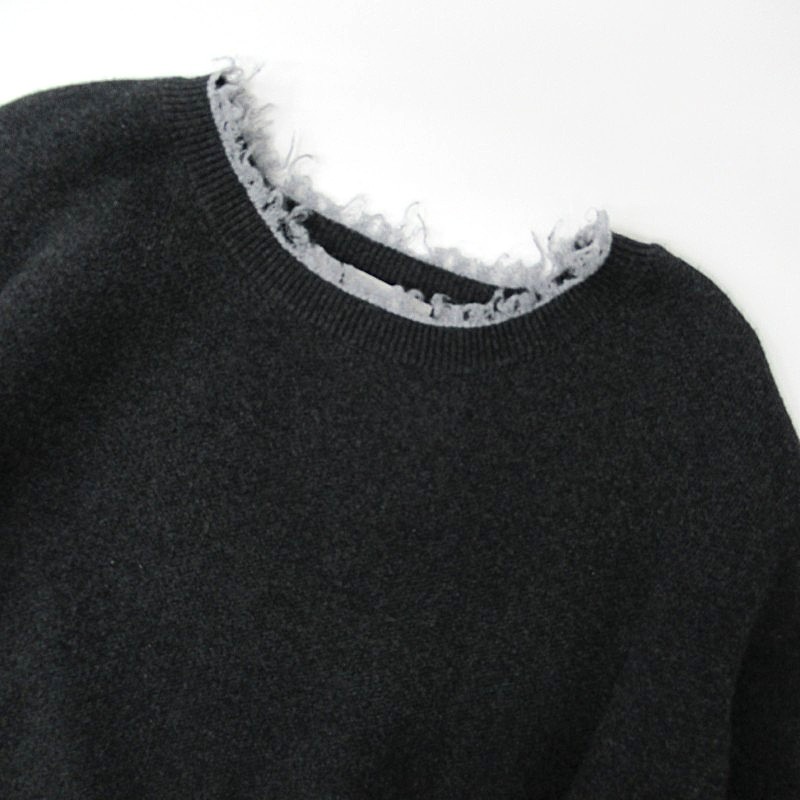 細糸でレースの様に施された衿ぐりが目を引くニットプルオーバー。