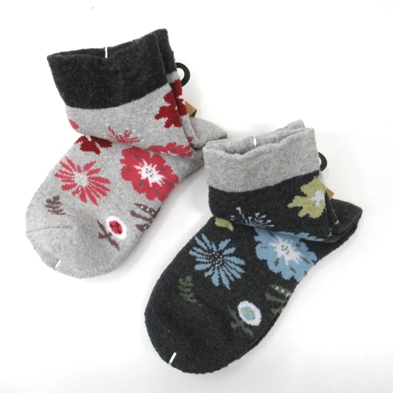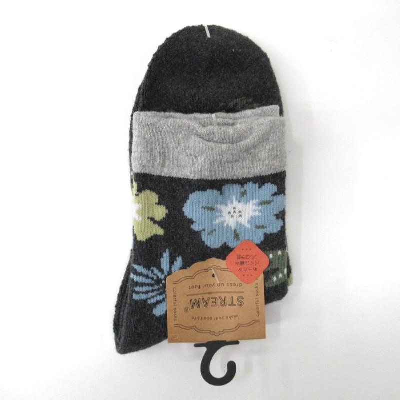 STREAM あったかアンゴラ混 カラー切替花柄パイルクルーソックス/GY