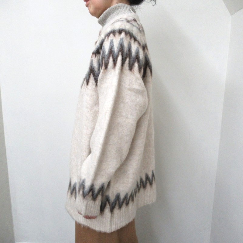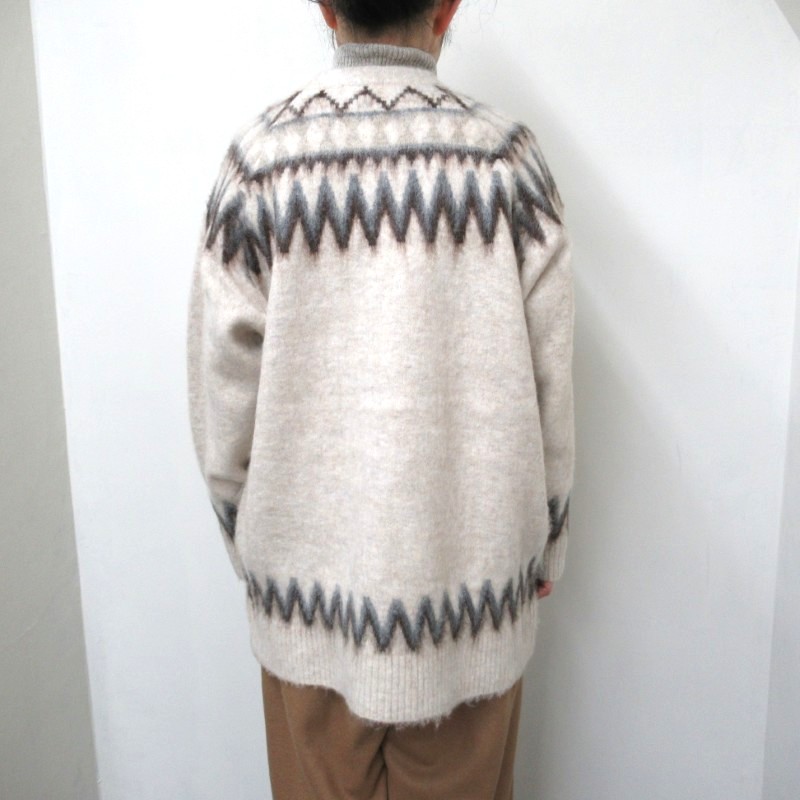 フェアアイル柄が目を引くオーバーサイズのカーディガン。
