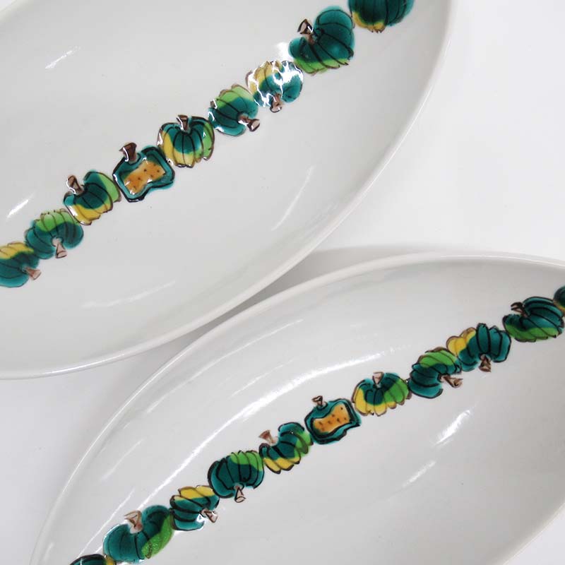 安東さんがやさしい筆致で描かれたカボチャのお皿が数量限定入荷です! ひとつひとつ違った角度や色合いのカボチャが11個も並んでます。1列に並んだだけですが、リズムが感じられて飽きずに見ていられます。