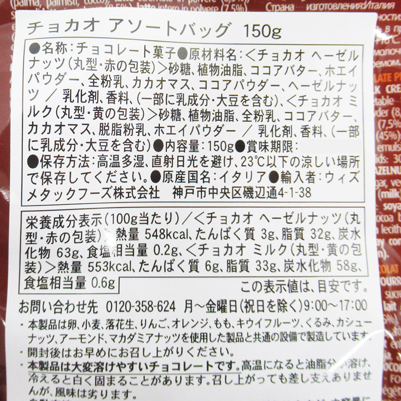 | 素材 | 原材料名:【ヘーゼルナッツ】佐藤、植物油脂、ココアパウダー、ホエイパウダー、全粉乳、カカオマス、ココアパウダー、ヘーゼルナッツ/乳化剤、香料(一部に乳製品・大豆を含む) 【ヘーゼルナッツ&シリアル】砂糖、植物油脂、ココアバター、全粉乳、カカオマス、シリアル、ホエイパウダー、ココアパウダー、ヘーゼルナッツ/乳化剤、香料(一部に乳成分・大豆を含む) 【ミルク&シリアル】砂糖、植物油脂、ココアパウダー、全粉乳、カカオマス、脱脂粉乳、ホエイパウダーシリアル、全粉乳/乳化剤、香料 【クリームフィリングチョコレート】砂糖、植物油脂、ココアパウダー、全粉乳、カカオマス、ヘーゼルナッツぺースト、ホエイパウダー、ココアパウダー、脱脂粉乳、乳糖/乳化剤、香料(一部乳成分・大豆を含む) |