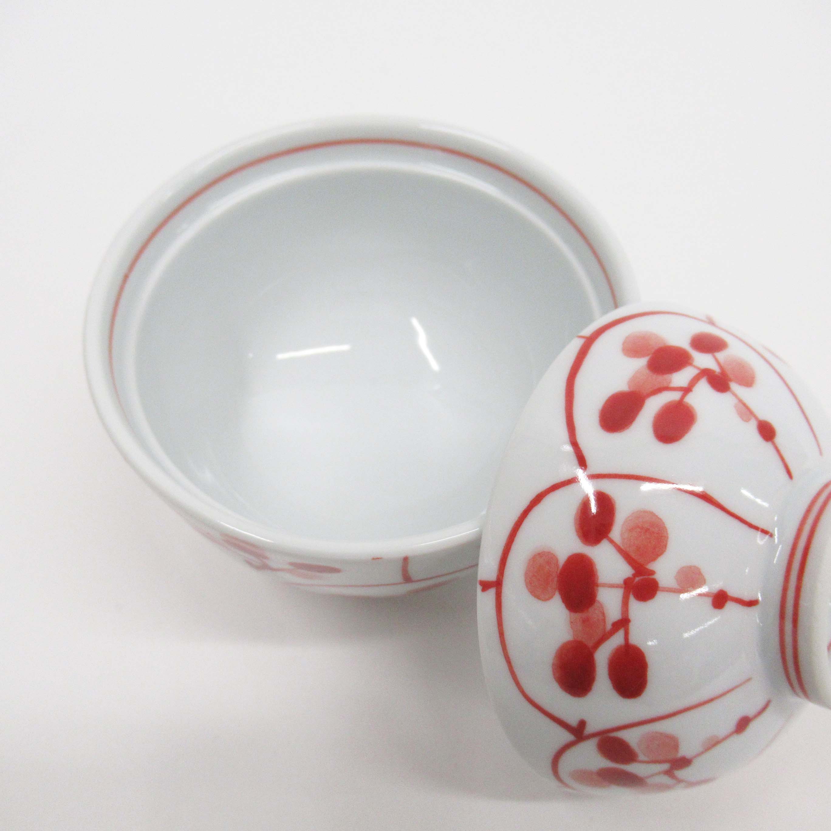 ころんと丸いフォルムに赤い実模様が映え、茶碗蒸しや小鉢にちょうどいいサイズ感で、日々の食卓にも、贈りものにもぴったりの蓋付き小鉢です。