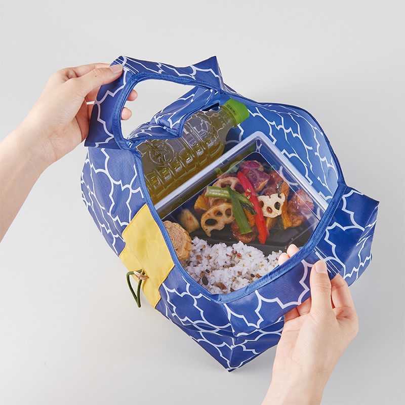 さっと取り出せて、くるんとゴムで巻いて簡単に収納できるモダンなエコバッグです。小ぶりでも広いマチで、コンビニのお弁当なども傾かずに入ります♪パッケージは中身が見え、和装の女の子のデザインに、ボタンとカラーゴムが帯留め風になっています。