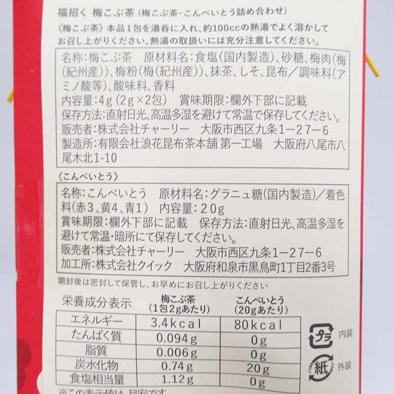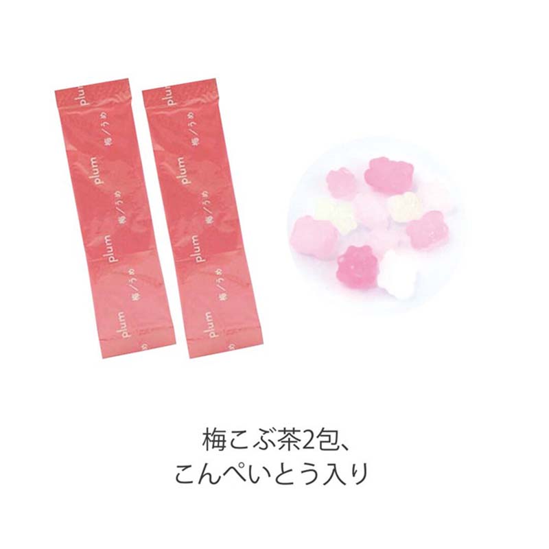 | サイズ | W100×D25×H140mm 梅こぶ茶2g×2包、こんぺいとう20g |