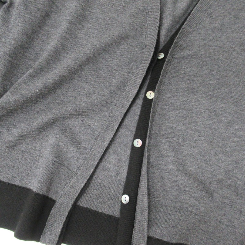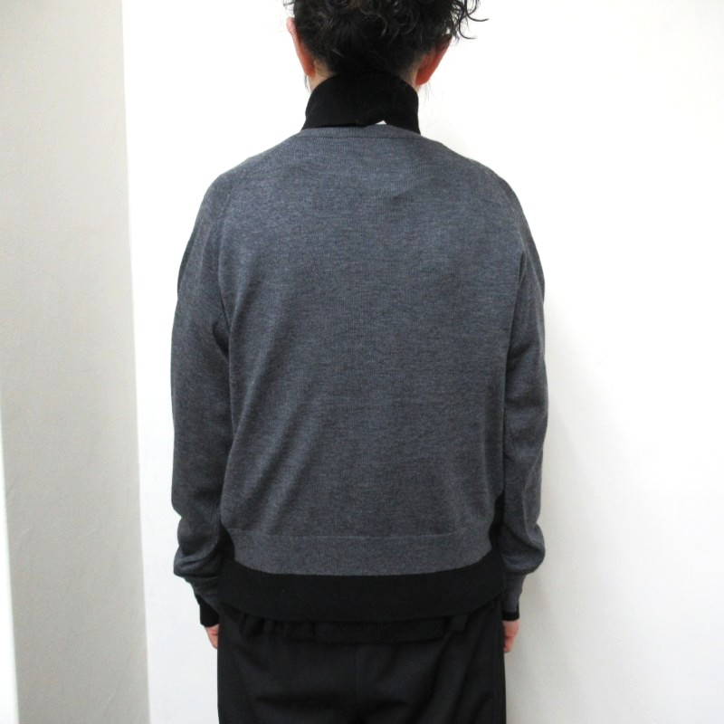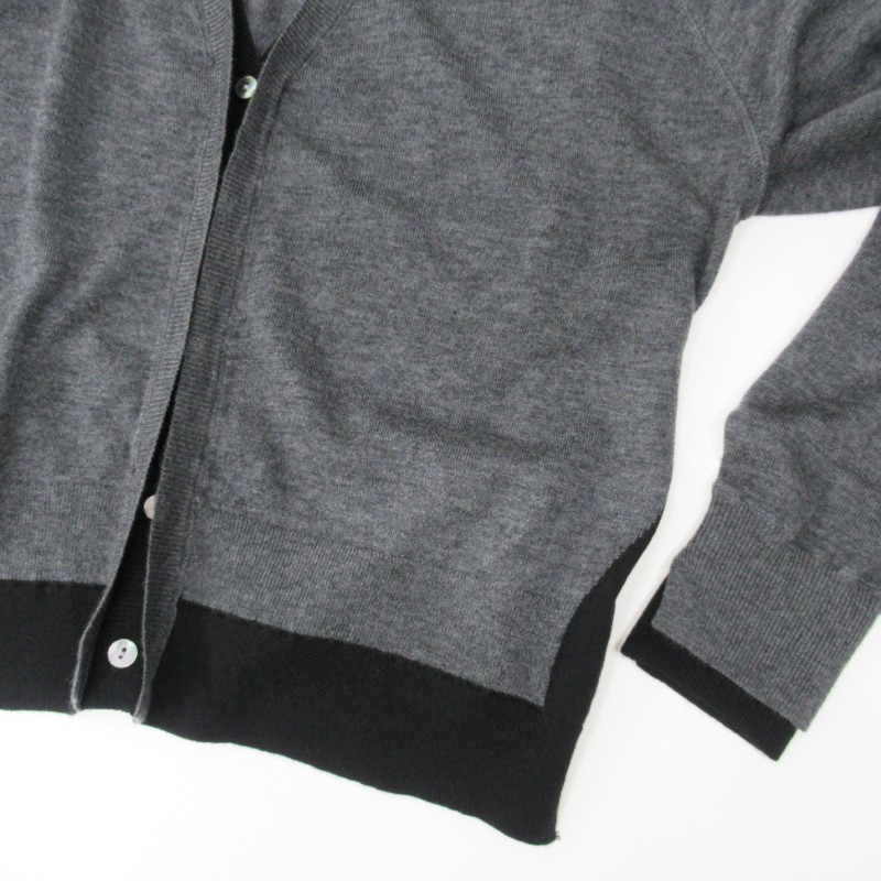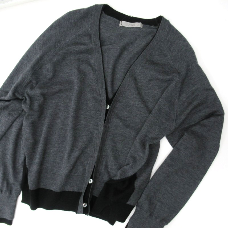 レイヤードしたようなバイカラーデザインのカーディガン。