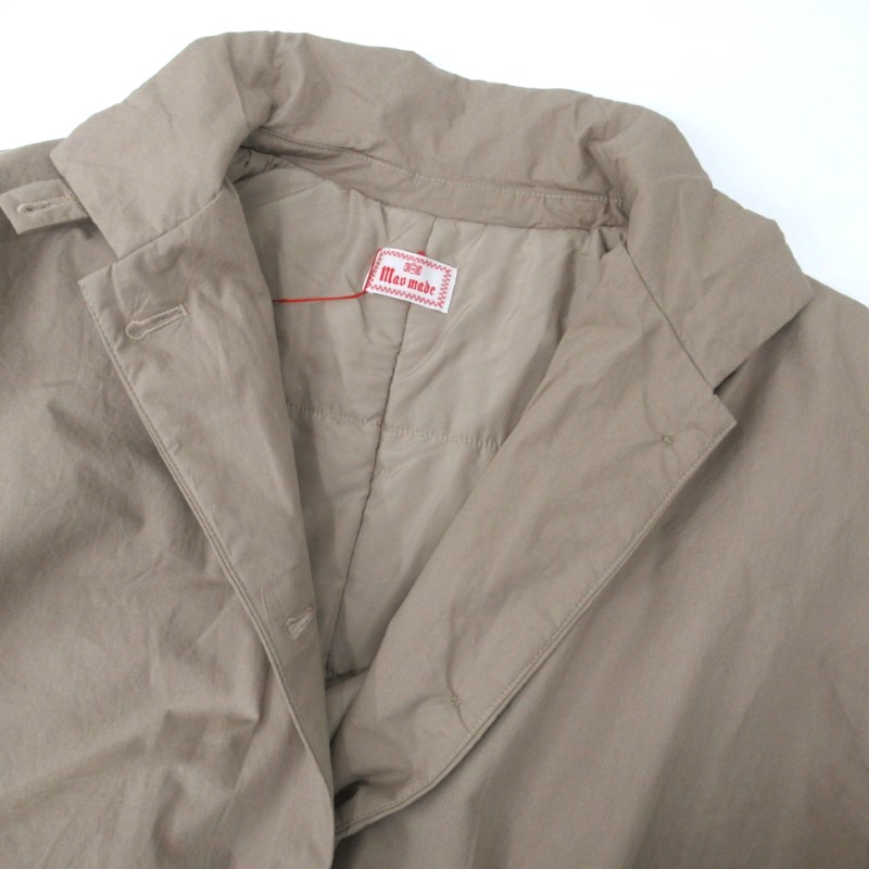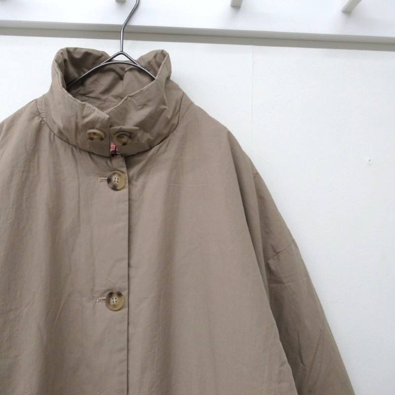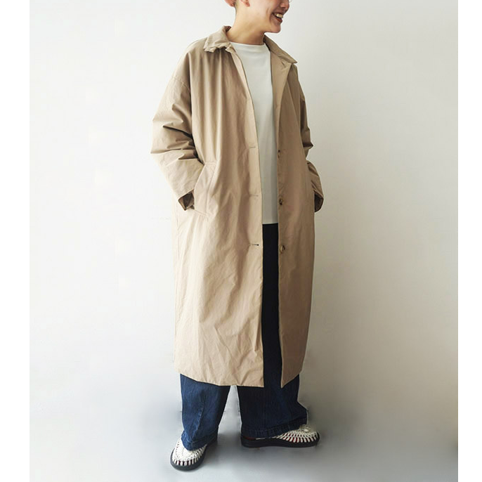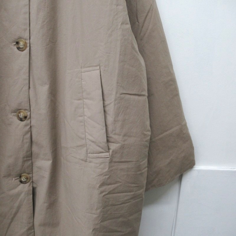 細番手の糸を高密度に織った適度なハリ感がある洗いがかったダンプ素材を表面に使用し、裏地にキルティング加工を施したNEW STANDARDロング丈中綿ステンカラーコートです。