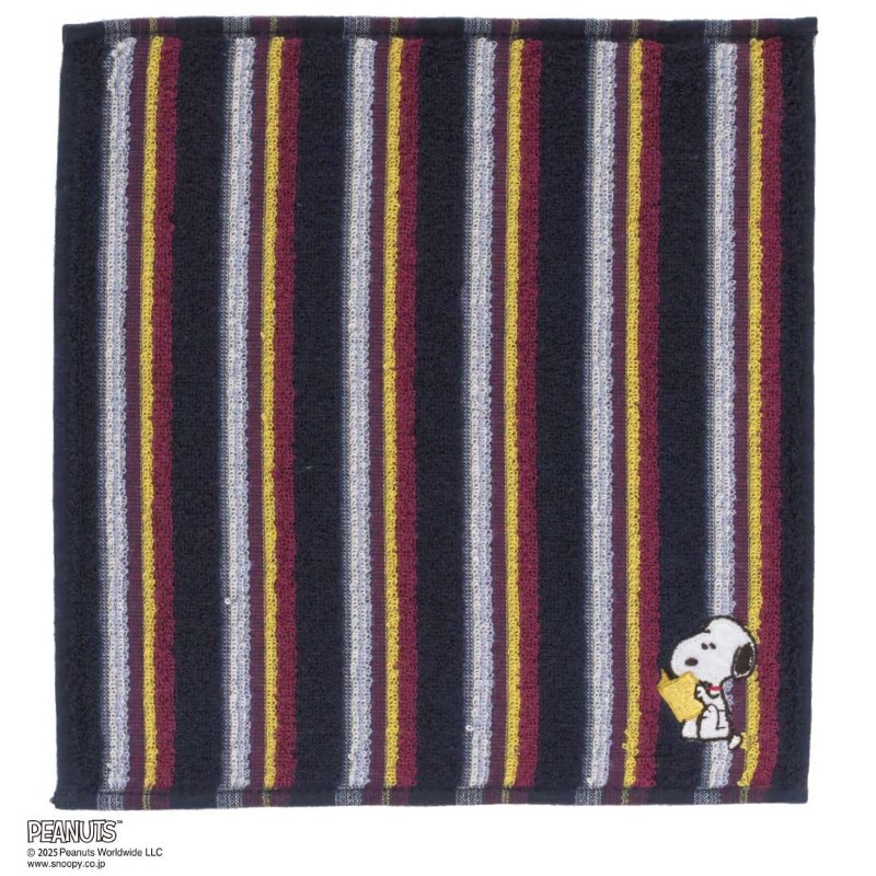 ボーダー柄と読書をするスヌーピーがポイントのタオルハンカチです。