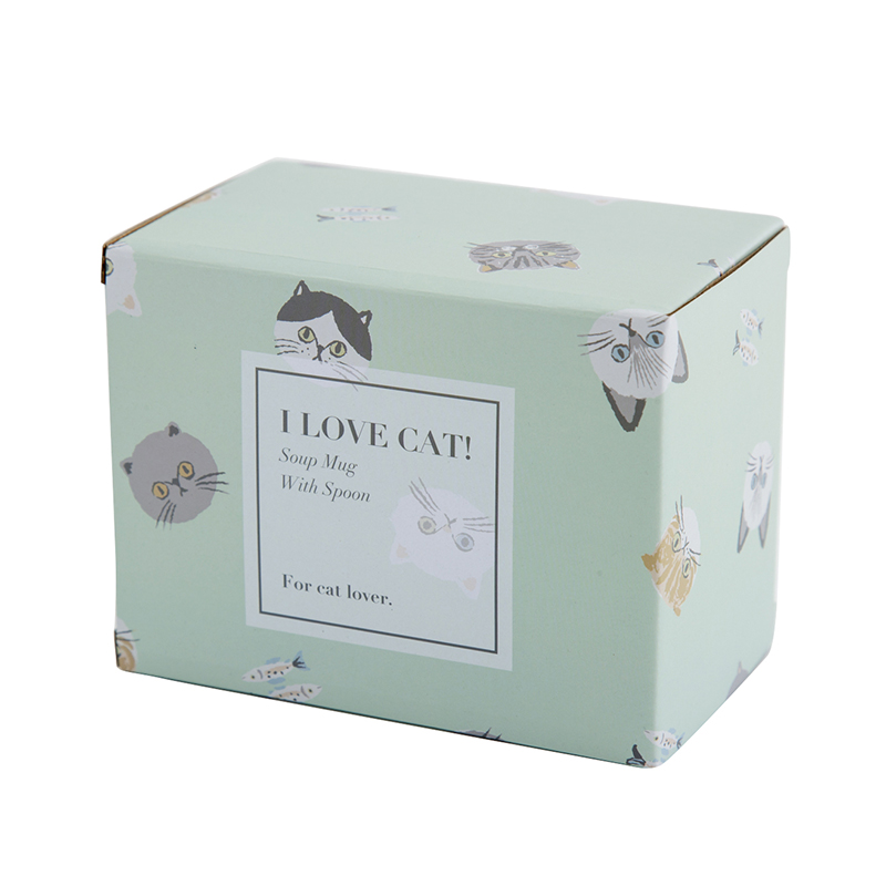 木製のスプーンがついたた、背の低い形のスープマグ。3匹の猫の顔のプリントがぐるりとされています。可愛い箱入りなので、ギフトにも喜ばれますよ。