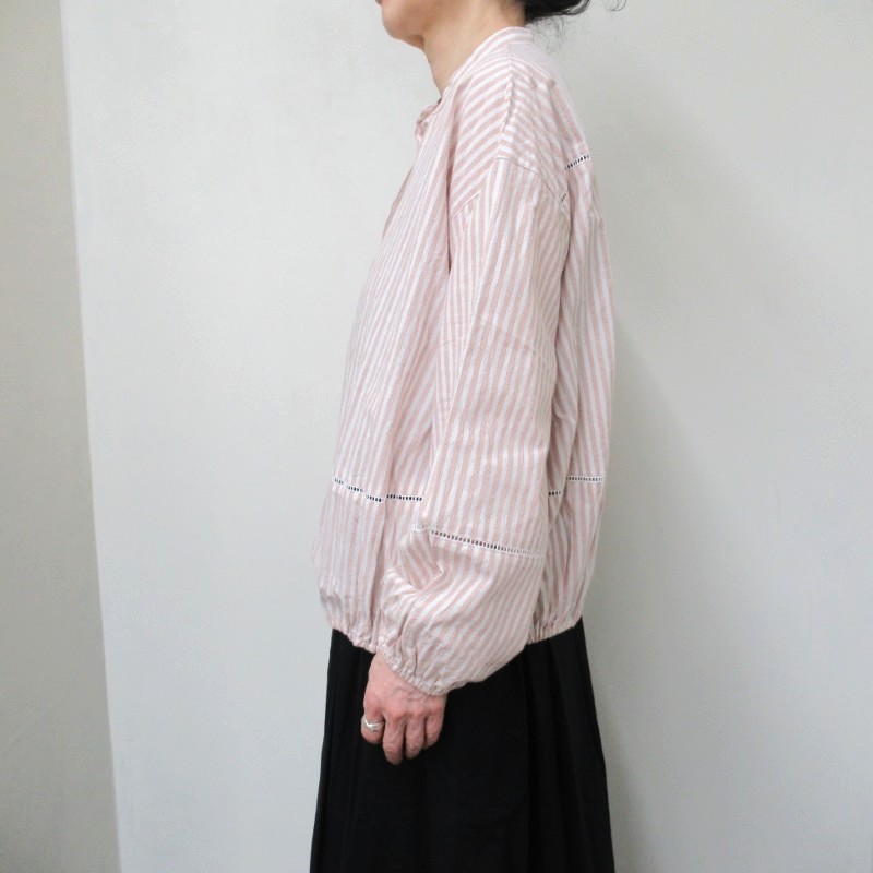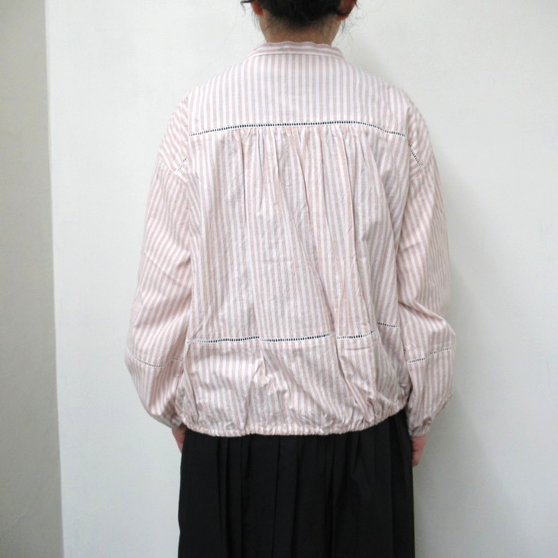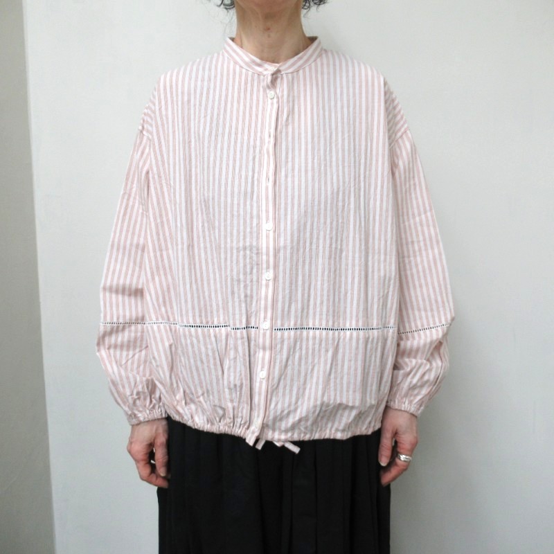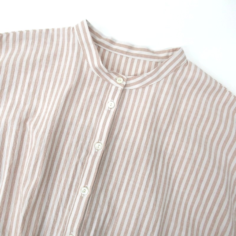 ギャザーを入れたフェミニンな雰囲気をすっきりとしたバンドカラーが甘さを抑えたデザインです。
