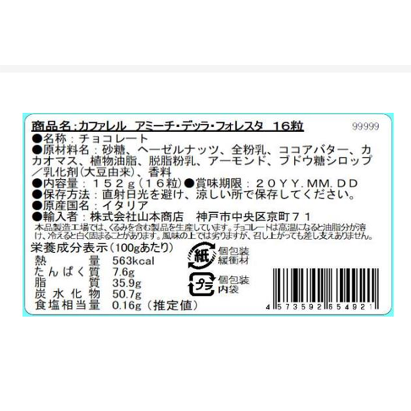| 備考 | 【カファレル】 1826年にイタリア北部の街、トリノで創業。1865年に当時としてはまったく新しいタイプのチョコレート「ジャンドゥーヤ」を創りだし、以来、そのユニークで香り高くとろけるような舌触りを持つチョコレートは、ヨーロッパ各国のグルメたちを魅了してきました。長い伝統と高い技術によって、生み出されている気品ある味と香りは、現在、エレガントな贈り物として世界中の人々に愛されています。 |