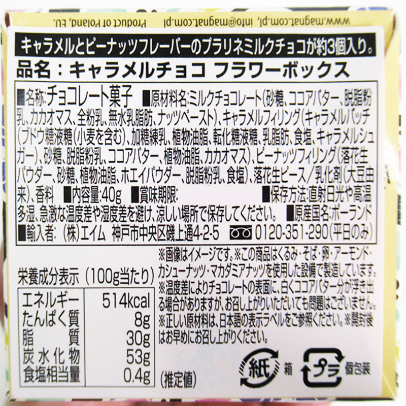 キャラメルtごピーナッツフレーバーのフィリング入りプラリネミルクチョコ。個包装で約3個入り。