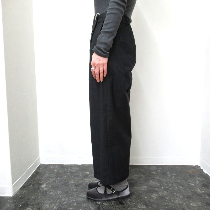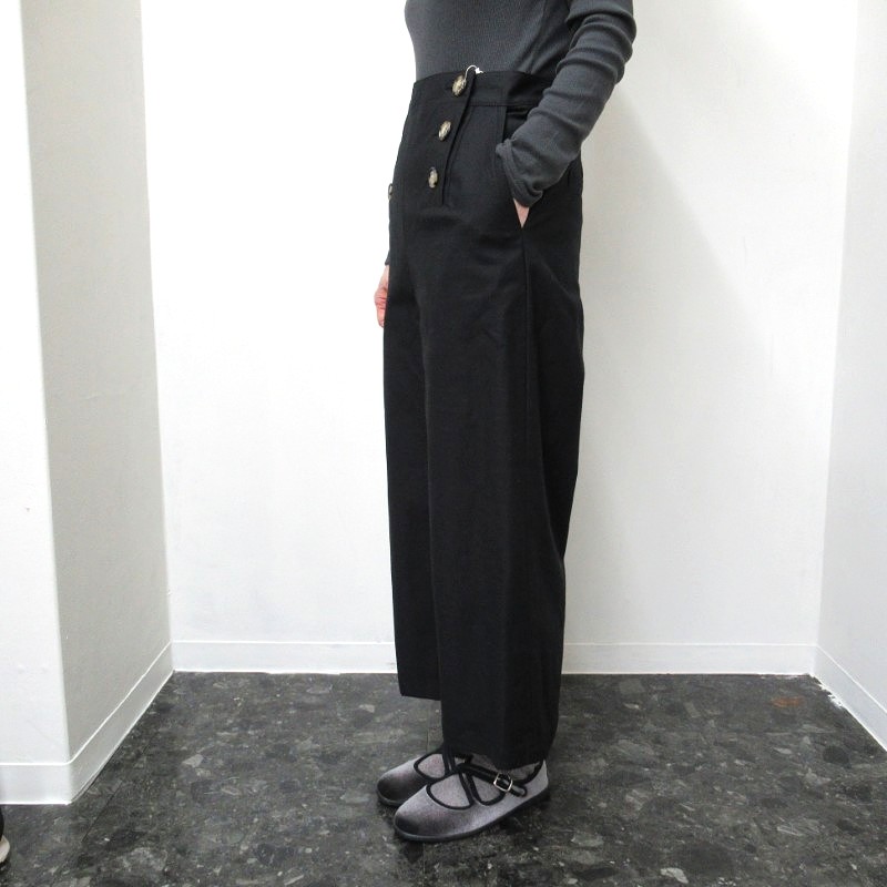 丈は八分丈のストレートで、ウェストは後ろのみゴム使用のため、すっきりとお召し頂けます。 ボタンにはLe minorの刻印が入ります。