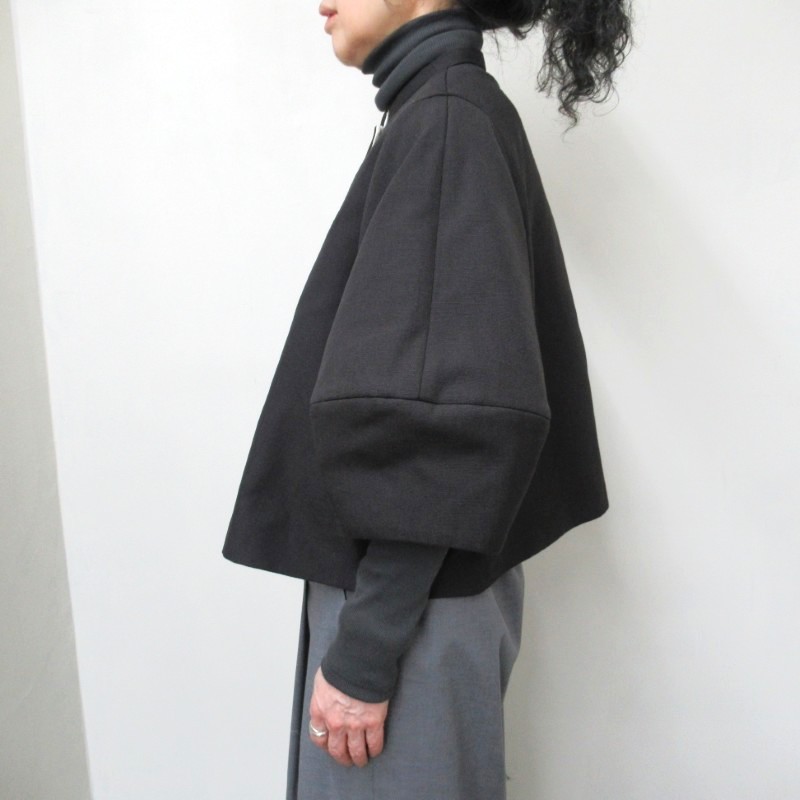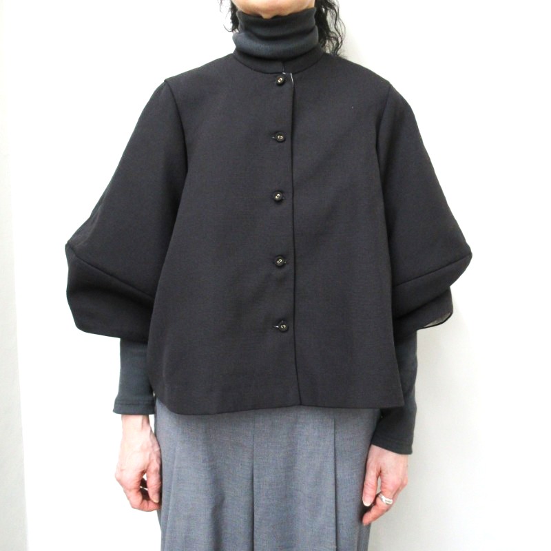 コクーンシルエットのボリュームスリーブがアクセントのジャケット。