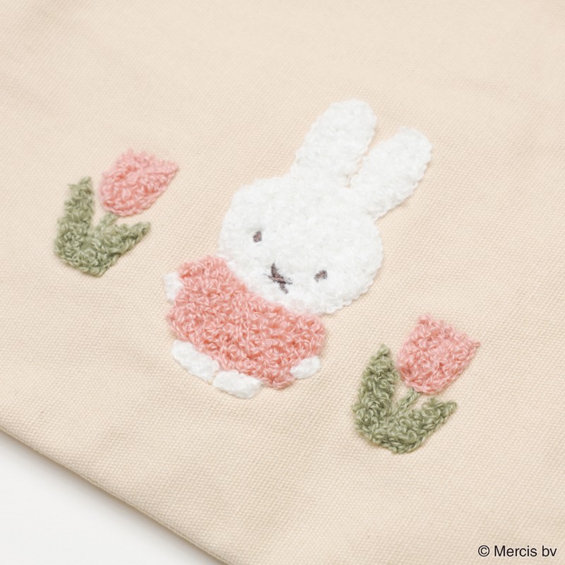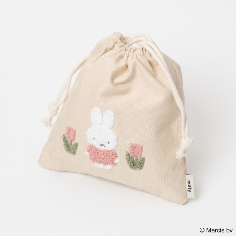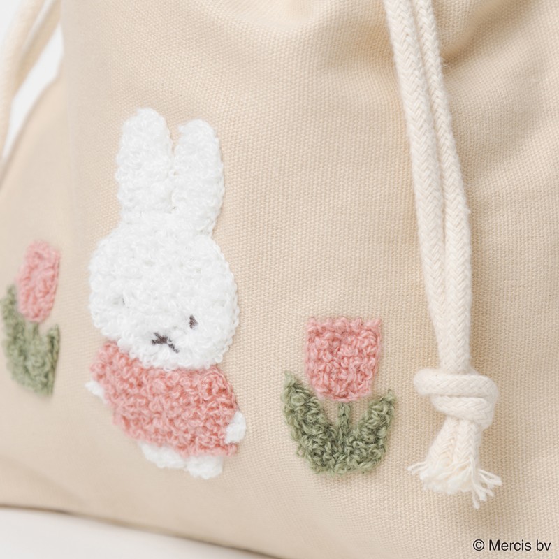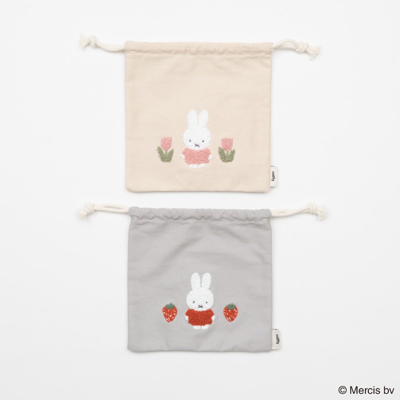ミッフィーとイチゴやチューリップの可愛いモチーフを、サガラ刺繍で仕上げたポーチのシリーズです。