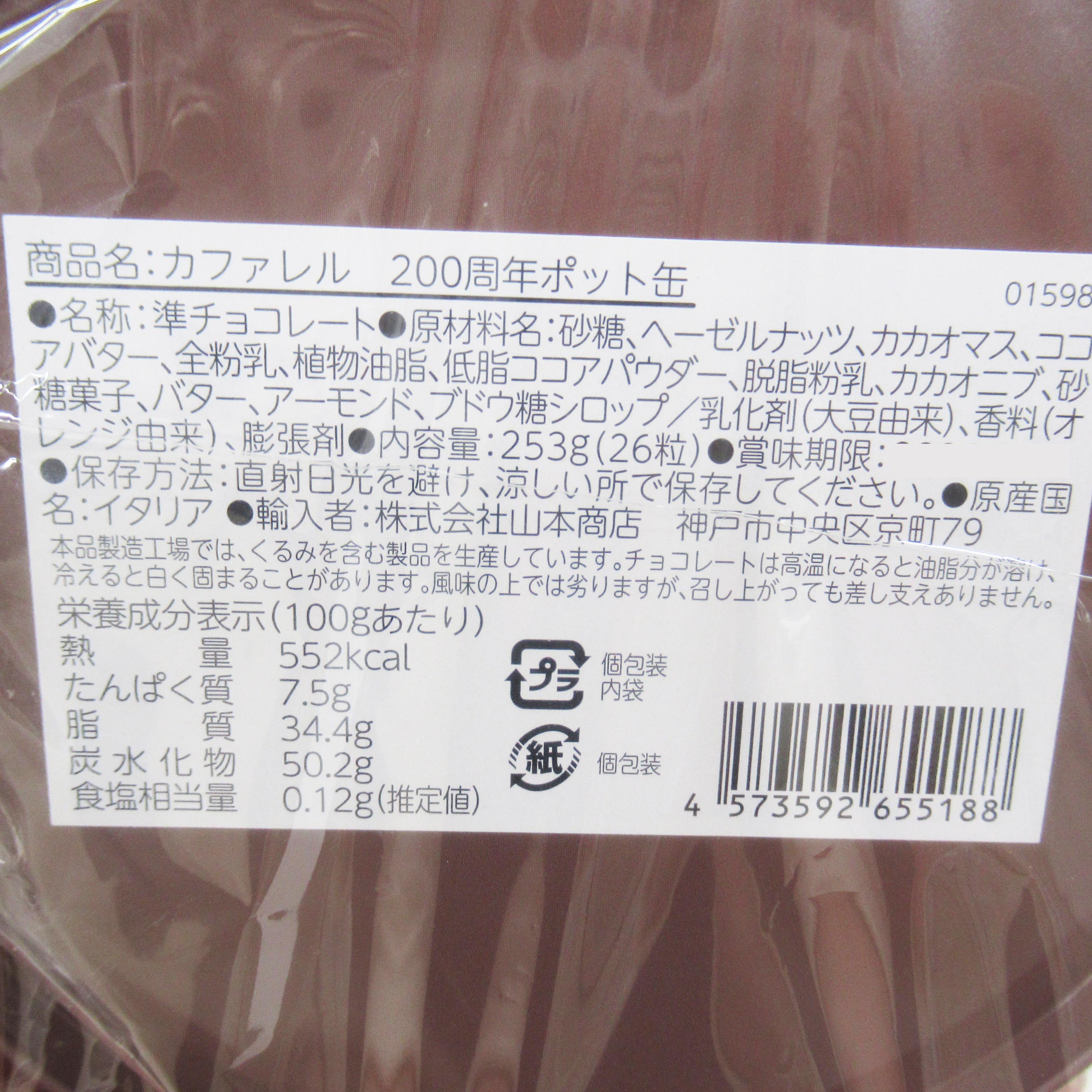 | 備考 | 【カファレル】 1826年にイタリア北部の街、トリノで創業。1865年に当時としてはまったく新しいタイプのチョコレート「ジャンドゥーヤ」を創りだし、以来、そのユニークで香り高くとろけるような舌触りを持つチョコレートは、ヨーロッパ各国のグルメたちを魅了してきました。長い伝統と高い技術によって、生み出されている気品ある味と香りは、現在、エレガントな贈り物として世界中の人々に愛されています。 |