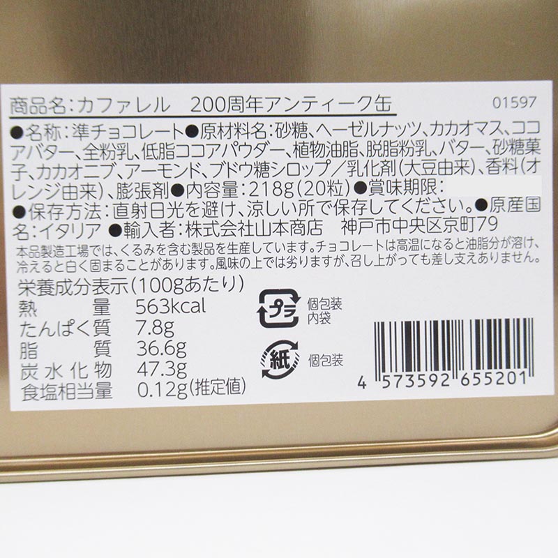 | 備考 | 【カファレル】 1826年にイタリア北部の街、トリノで創業。1865年に当時としてはまったく新しいタイプのチョコレート「ジャンドゥーヤ」を創りだし、以来、そのユニークで香り高くとろけるような舌触りを持つチョコレートは、ヨーロッパ各国のグルメたちを魅了してきました。長い伝統と高い技術によって、生み出されている気品ある味と香りは、現在、エレガントな贈り物として世界中の人々に愛されています。 |