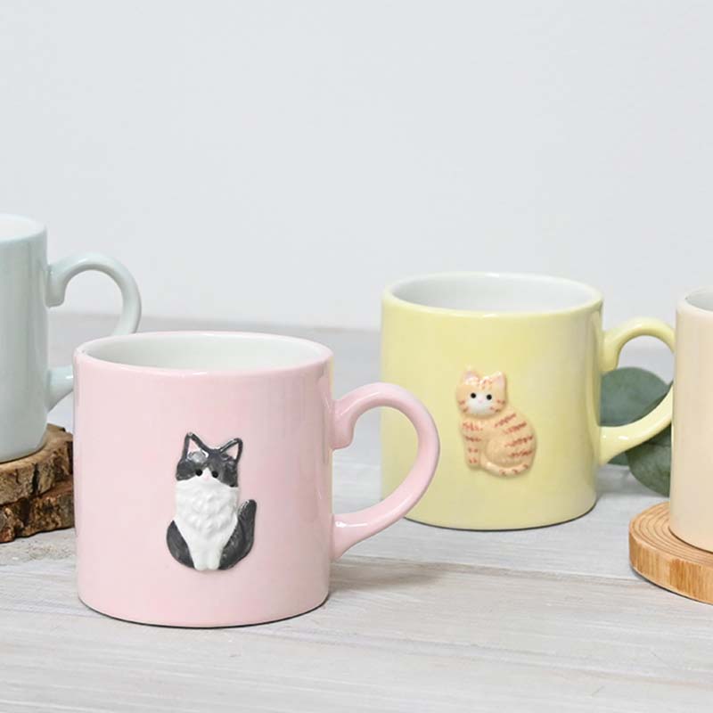 ちょこんと座って見つめてくる姿が愛くるしい猫ちゃん。ティータイムにぴったりのマグカップです。