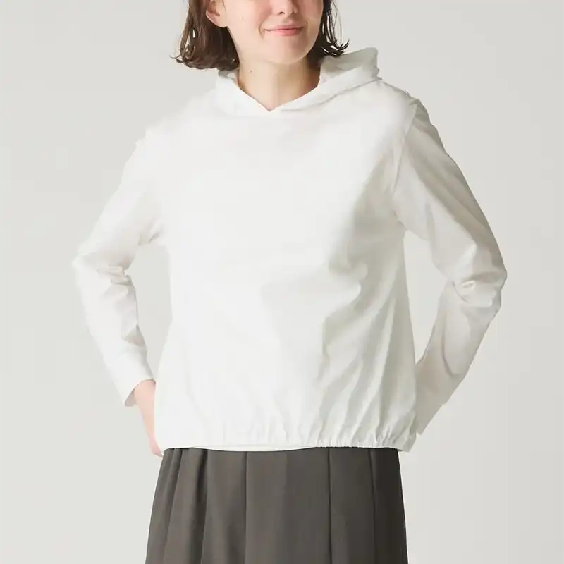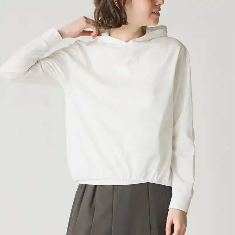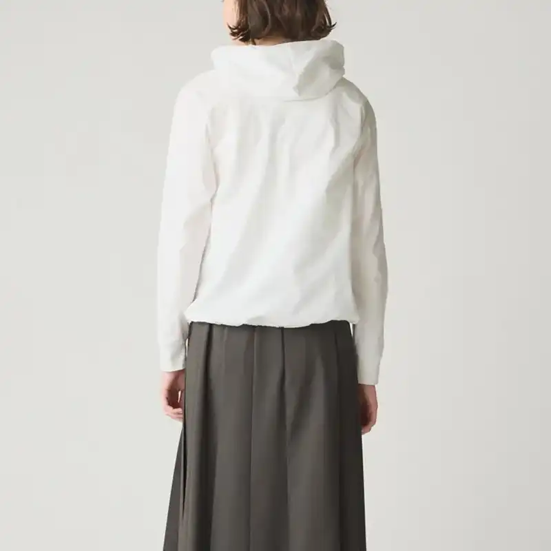 一枚での着用はもちろん、インナーとしても着用いただけるフード付きプルオーバー。裾部分のデザインがさりげないアクセントとなります。