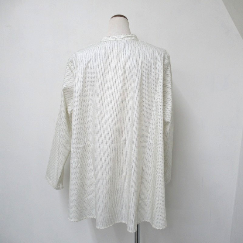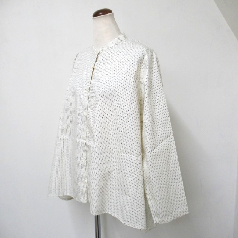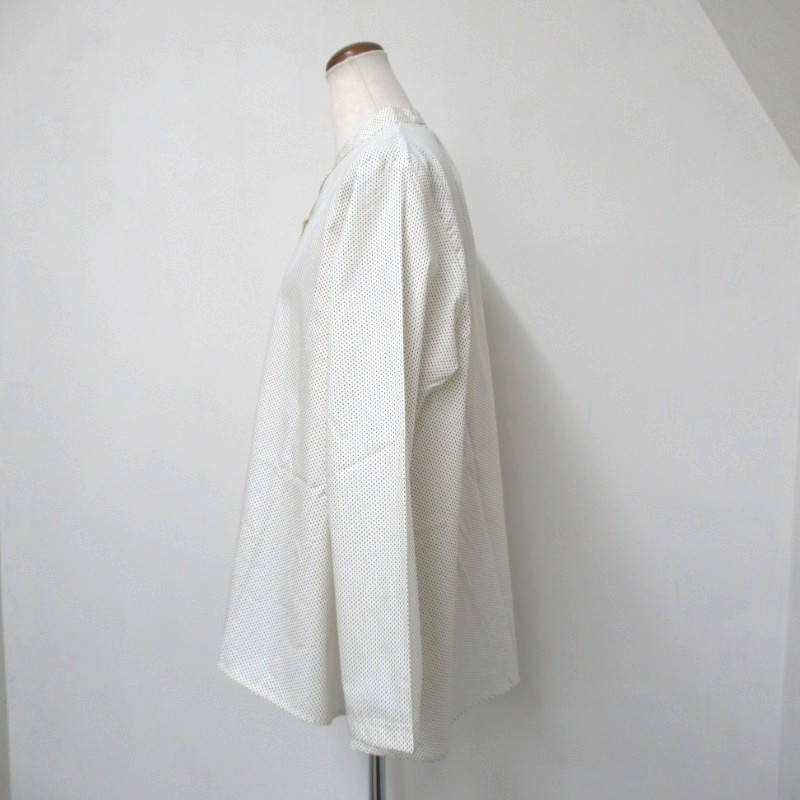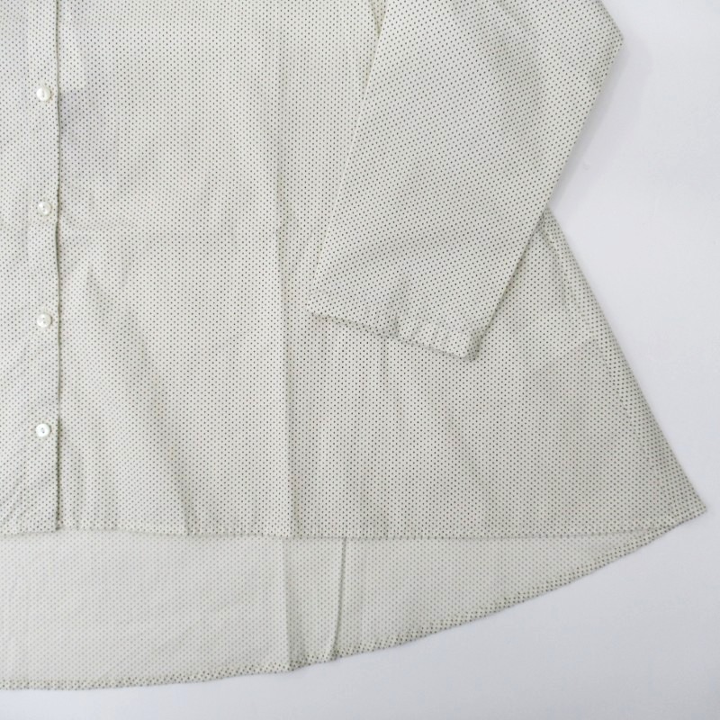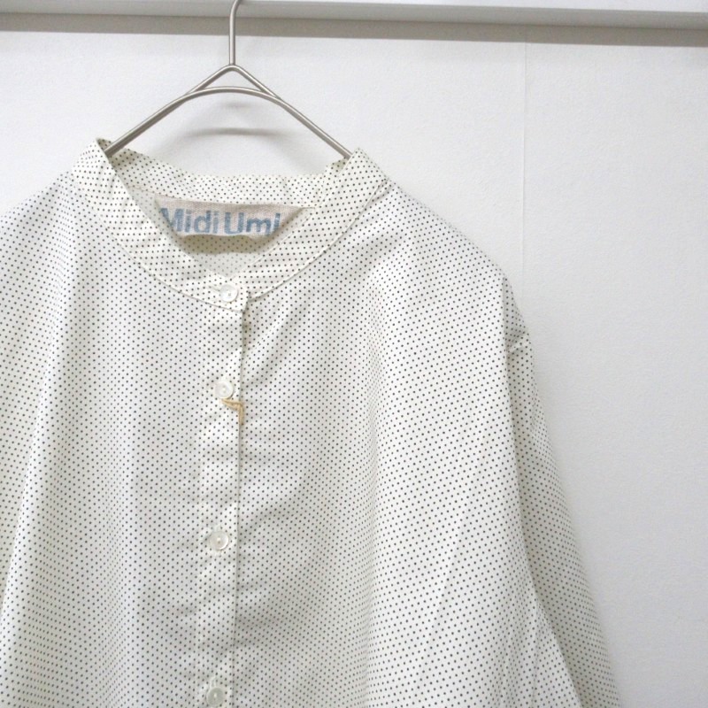 襟元はバンドカラーですっきりしたデザイン。さらりと着用いただける人気のドットアイテムです。