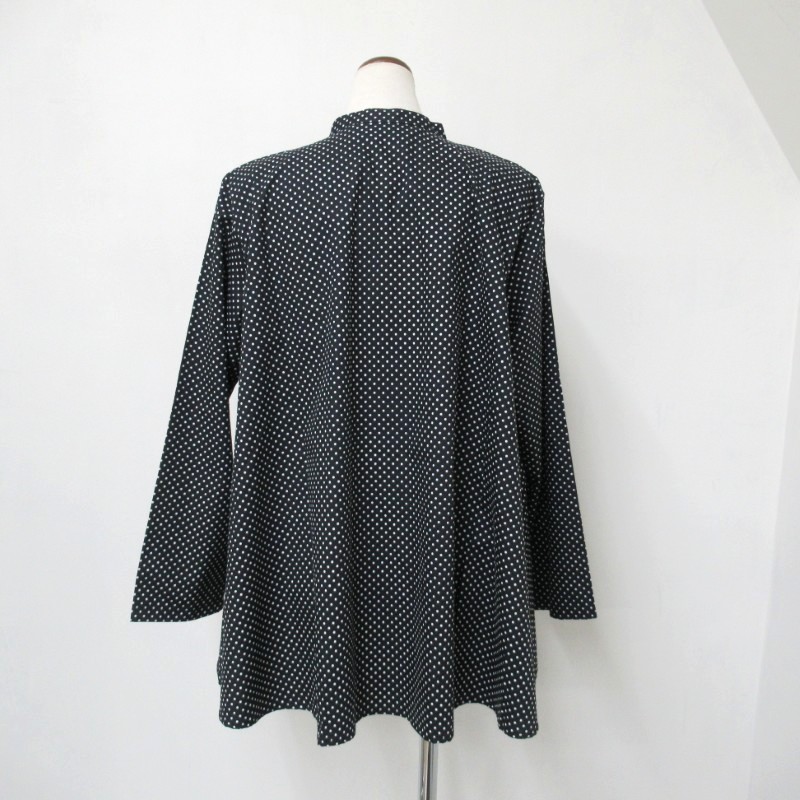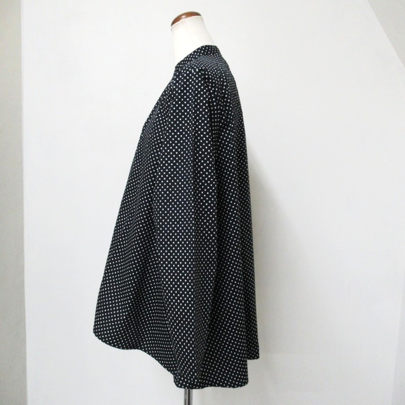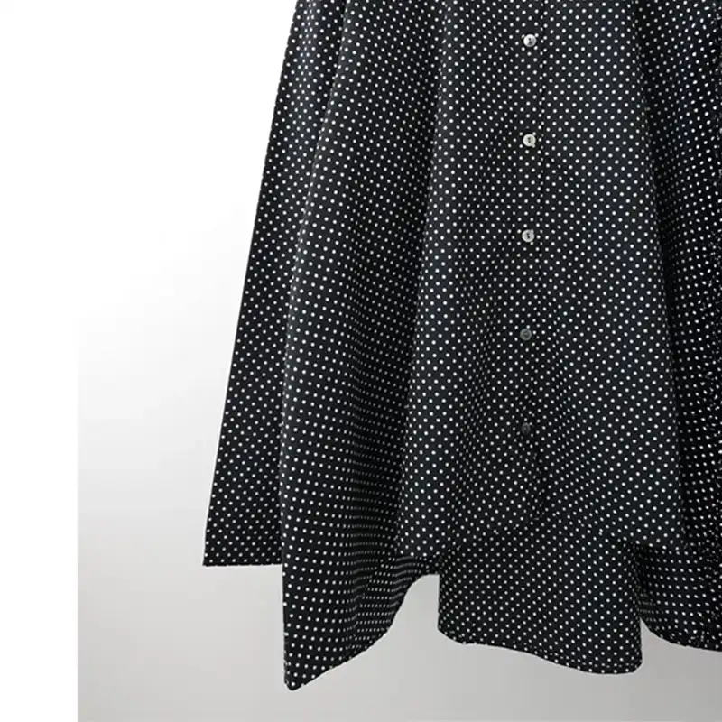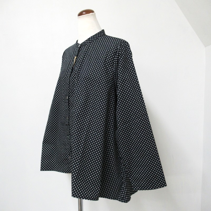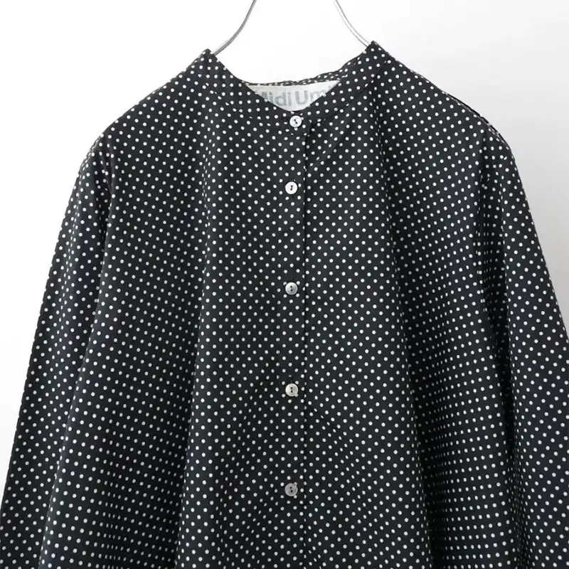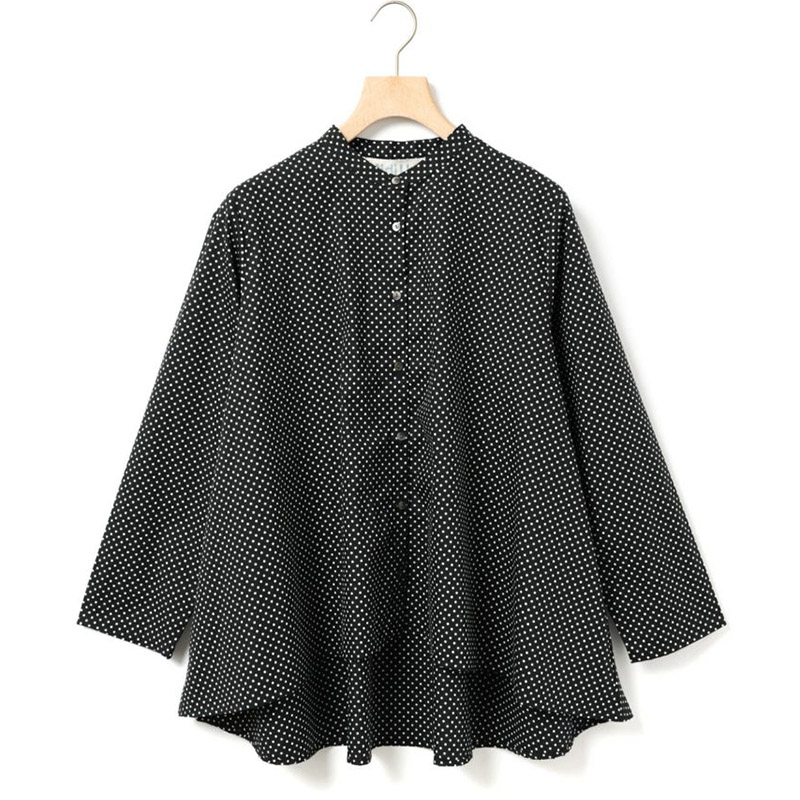 襟元はバンドカラーですっきりしたデザイン。さらりと着用いただける人気のドットアイテムです。