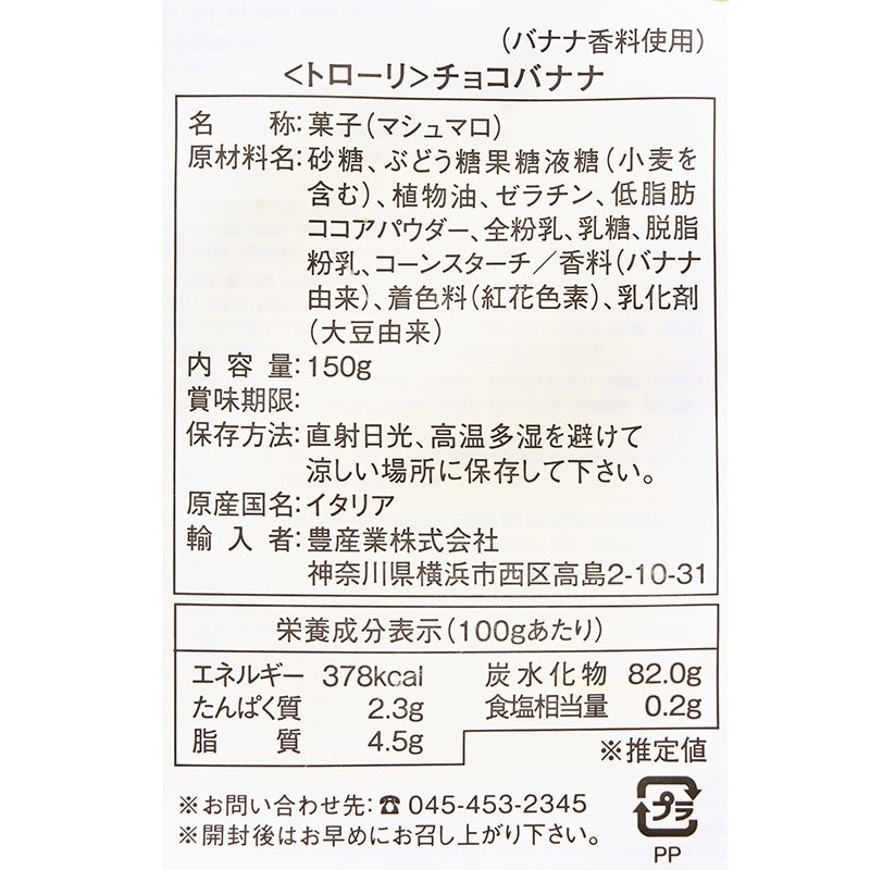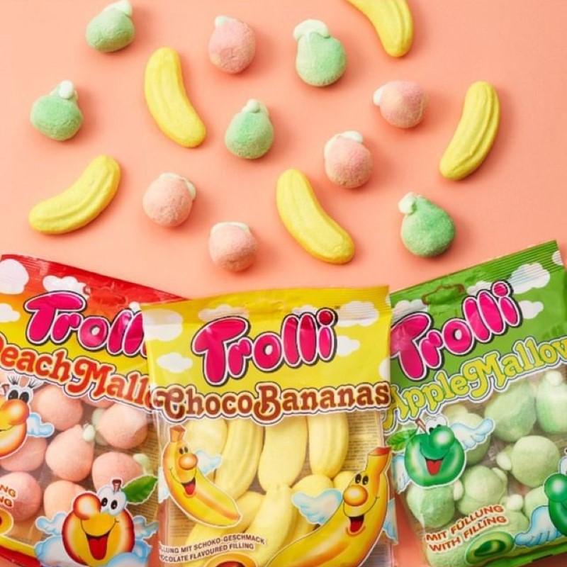 人気のトローリから「チョコバナナ」がラインアップ! ふわふわ食感のバナナマシュマロの中に、ココアクリームが入っています。まるで本物のチョコバナナのような味わいが楽しめます。