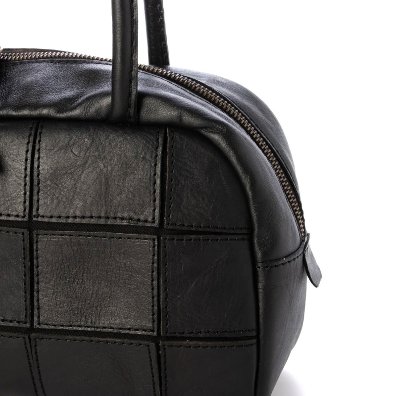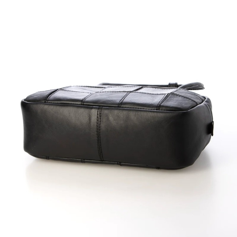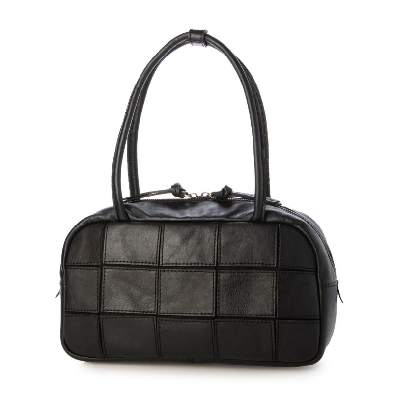 四角くカットされたレザーパーツを丁寧にパッチワーク状に縫製をした、素朴でありながらも洗練された表情のバッグです。