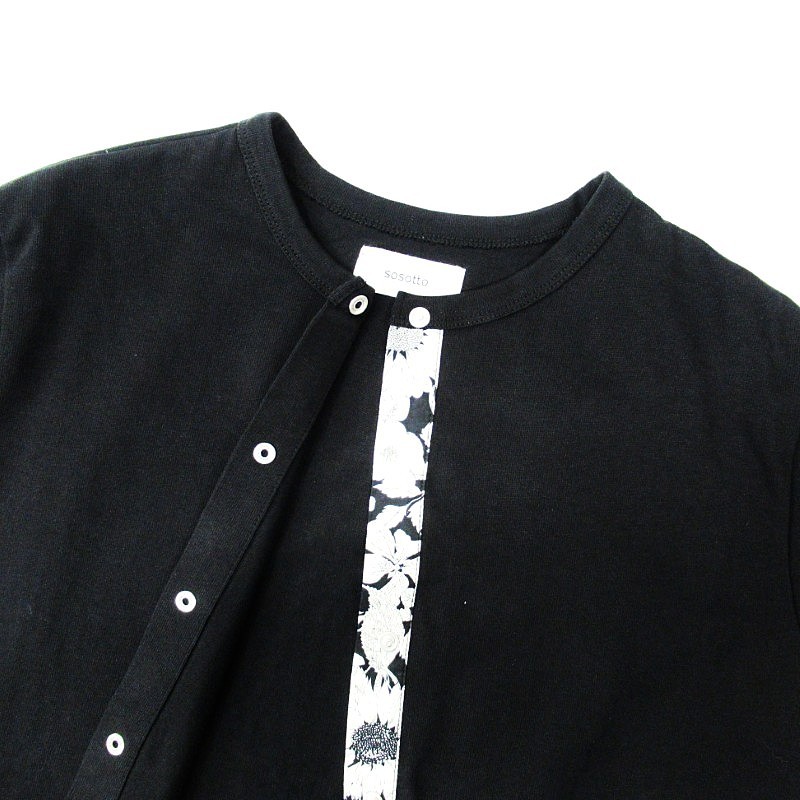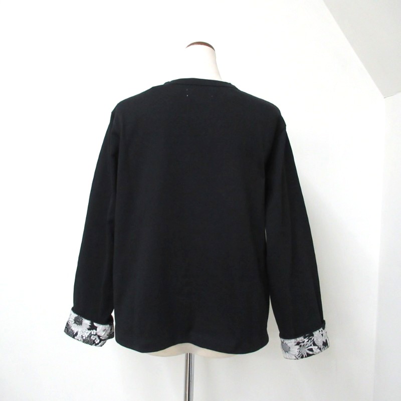 リバティは前立て、袖裏に使用。ドット釦を閉めると無地見えですが、開けると前立て、袖をまくるとリバティが現れ華やかな印象に。