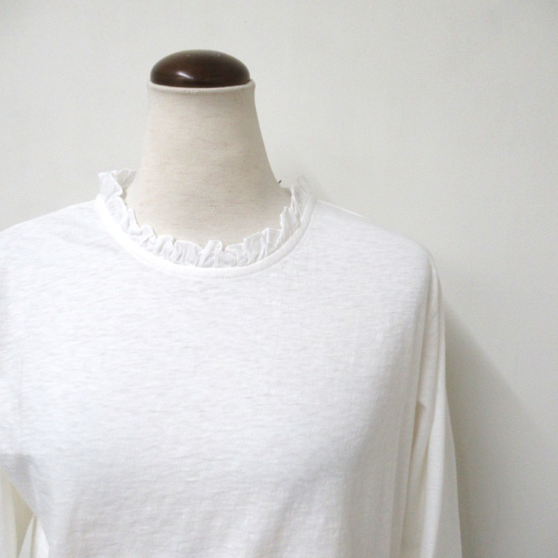 布帛のフリルカラーが上品な雰囲気のバーフィル天竺プルオーバー。